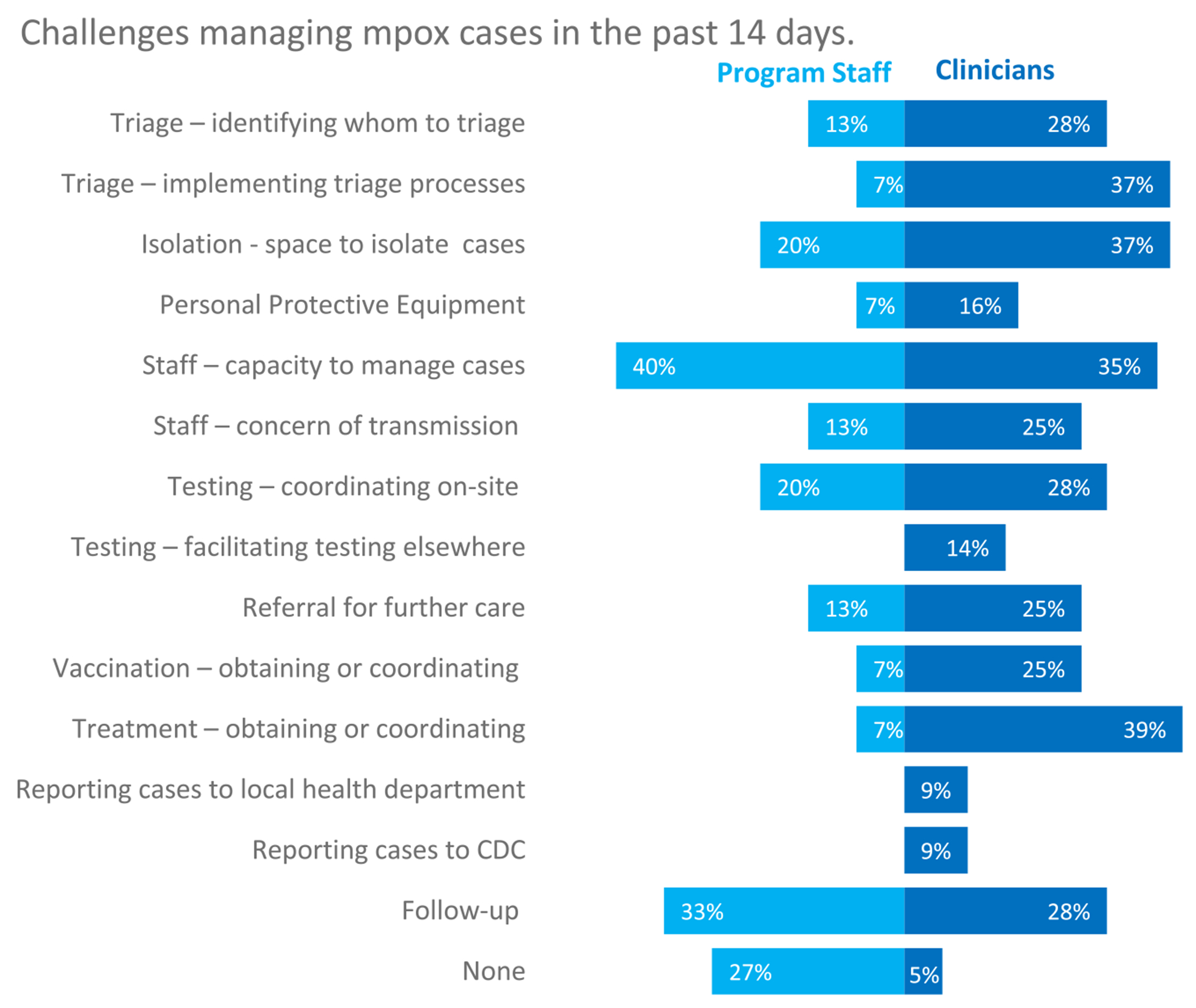 Among 168 responses by clinicians (n = 131, 78%) and program staff (n = 37, 22%), more than half (51%) reported at least somewhat significant mpox-related clinical disruptions including burdensome paperwork requirements for mpox testing (40%) and tecovirimat use (88%). Long clinic visits (51%) added additional burden, and the median mpox-related visit lasted 1 hour. Few clinicians felt comfortable with advanced pain management, and clinicians felt most uninformed about preexposure (19%) and postexposure (24%) prophylaxis. Of 89 respondents involved in vaccination, 61% reported using equity strategies; however, accounts of these strategies revealed a focus on guideline or risk factor–based screenings instead of equity activities.