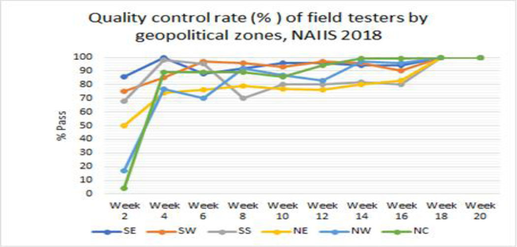 NAIIS data collection was completed in 23 weeks, ahead of the originally scheduled 24 weeks. Responsive design identified and resolved approximately 68,000 interview errors, affecting approximately 62,000 households, saving about US$4.4 million in costs. Biweekly field laboratory test quality control improved from 50% to 100% throughout NAIIS.