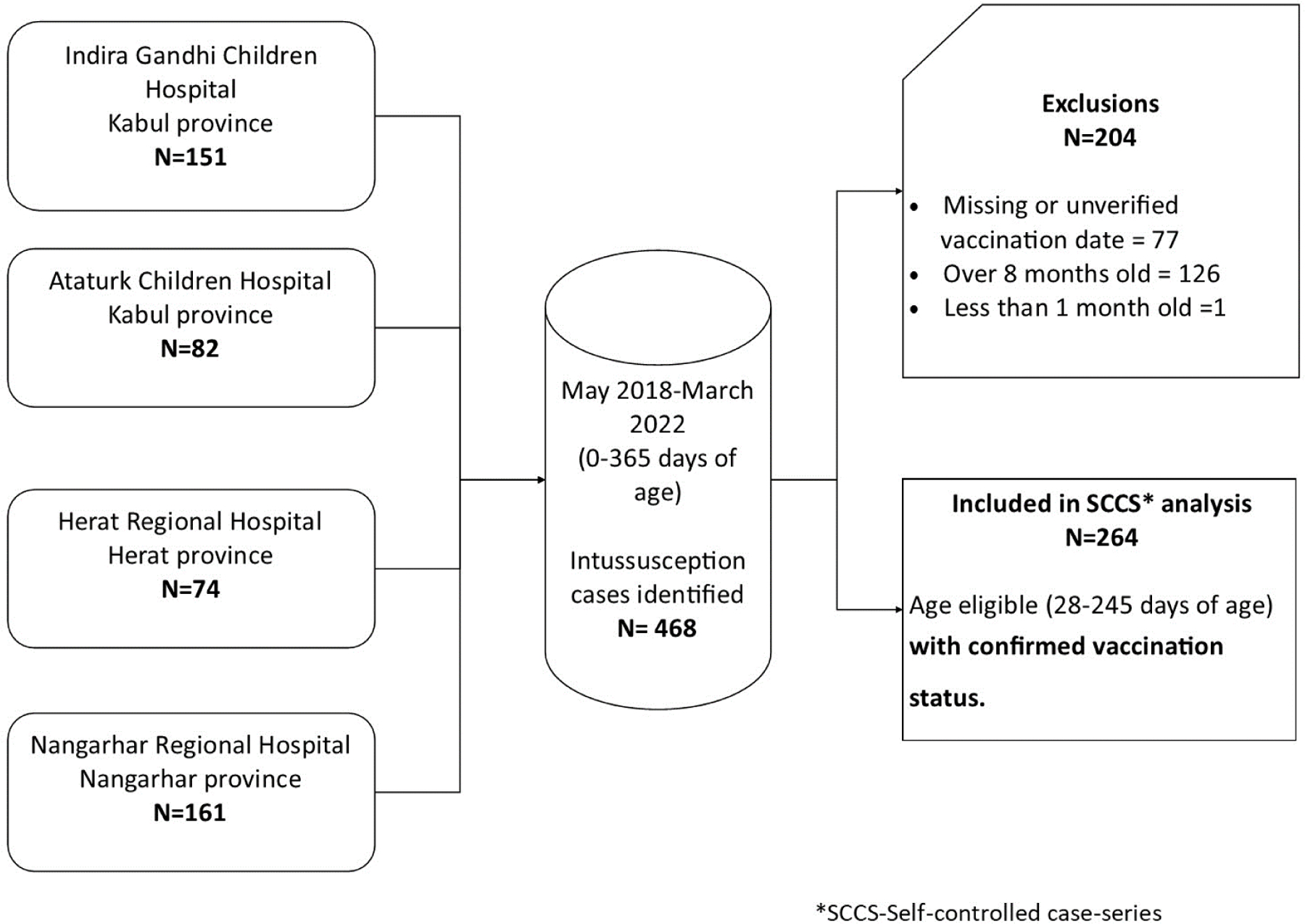 In January 2018, Afghanistan introduced the monovalent oral rotavirus vaccine (Rotarix) nationwide, administered as a 2-dose series at six and ten weeks of age. We describe characteristics of intussusception cases and assess potential intussusception risk associated with Rotarix vaccination in Afghan infants.