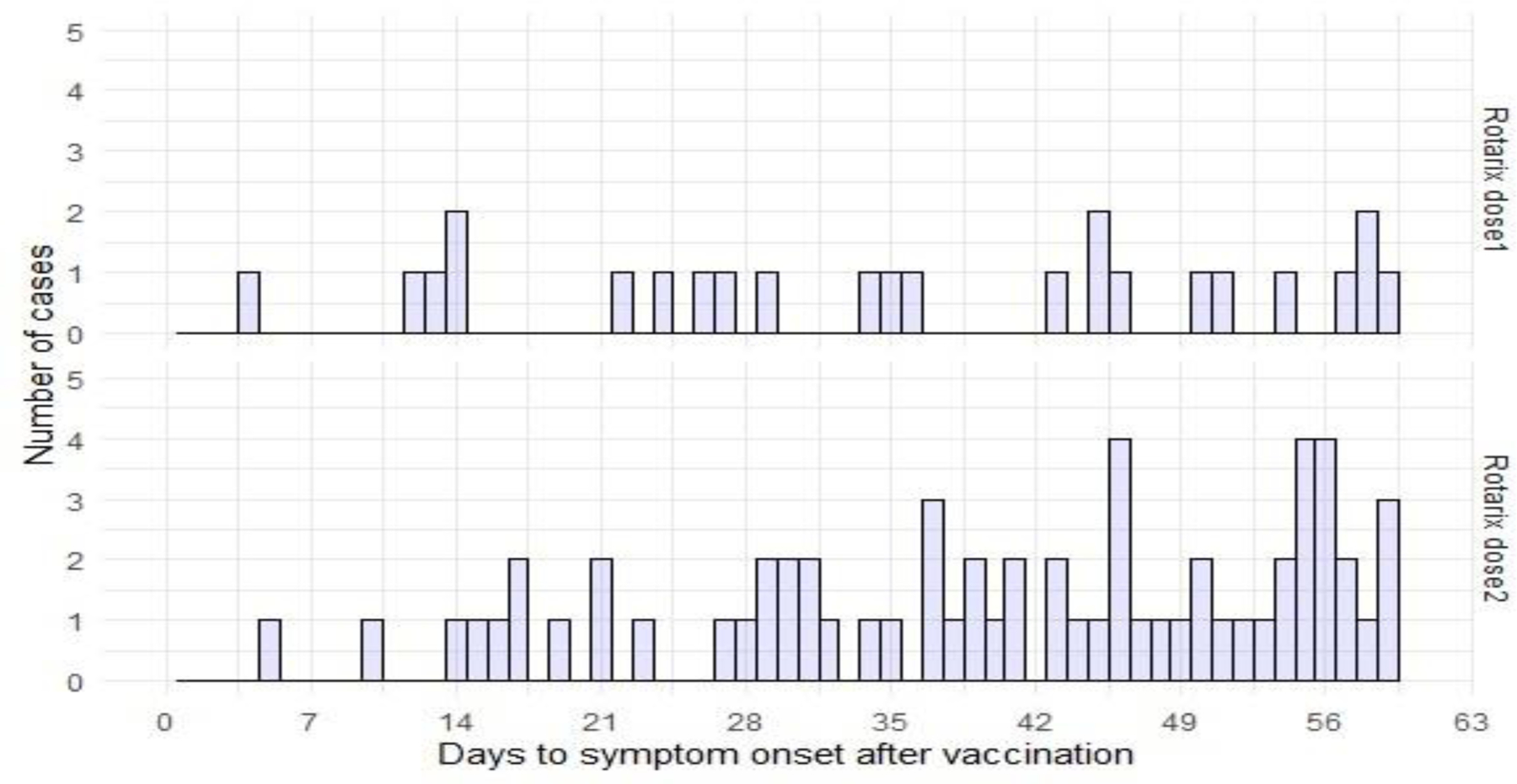 A total of 468 intussusception cases were identified in infants under 12 months, with 264 cases aged between 28 and 245 days having confirmed vaccination status contributing to the SCCS analysis. Most case-patients (98%) required surgery for treatment, and over half (59%) of those who underwent surgery required intestinal resection. Nineteen (7%) case-patients died. Eighty-six percent of case-patients received the first dose of Rotarix, and 69% received the second dose before intussusception symptom onset. There was no increased risk of intussusception in the 1–7 days (relative incidence: 0.9, 95% CI: 0.1, 7.5), 8–21 days (1.3, 95% CI: 0.4, 4.2), or 1–21 days (1.1, 95% CI: 0.4, 3.4) following receipt of the first dose or in the 1–7 days (0.2, 95% CI: 0.3, 1.8), 8–21 days (0.7, 95% CI: 0.3, 1.5), or 1–21 days (0.6, 95% CI: 0.3, 1.2) following the second dose.