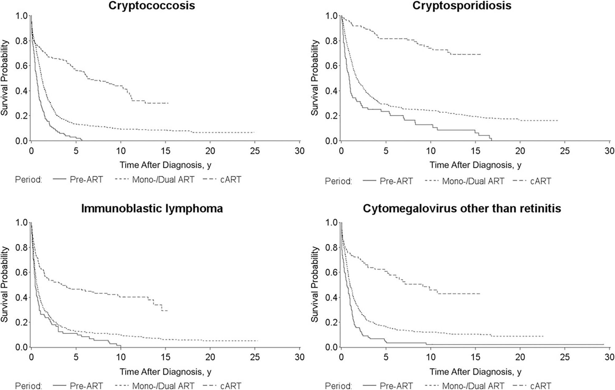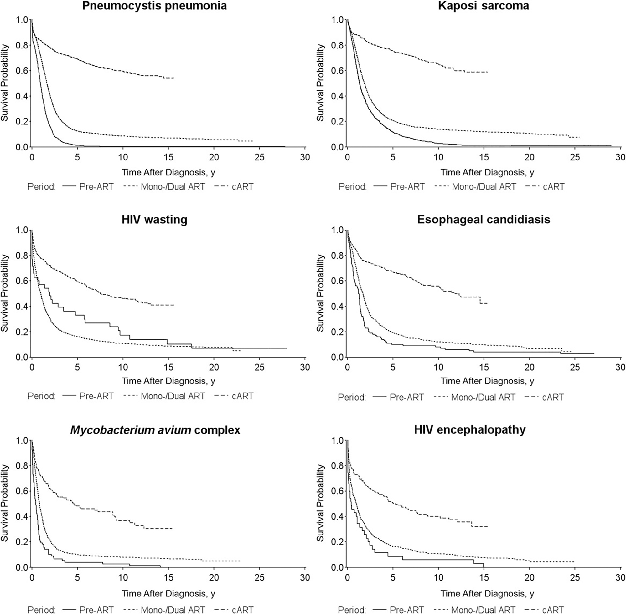 To examine whether improved human immunodeficiency virus (HIV) treatment was associated with better survival after diagnosis of AIDS-defining opportunistic illnesses (AIDS-OIs) and how survival differed by AIDS-OI.