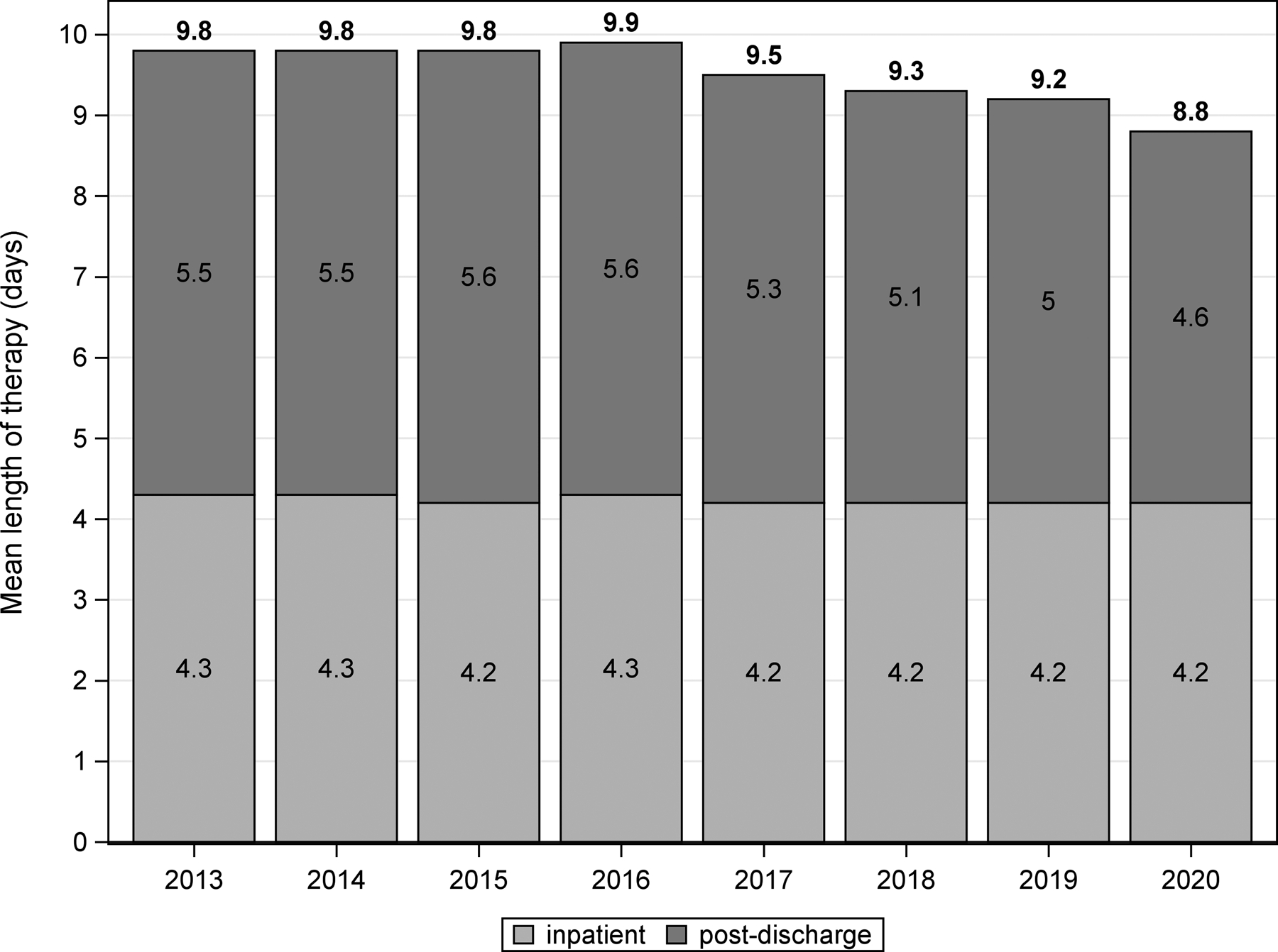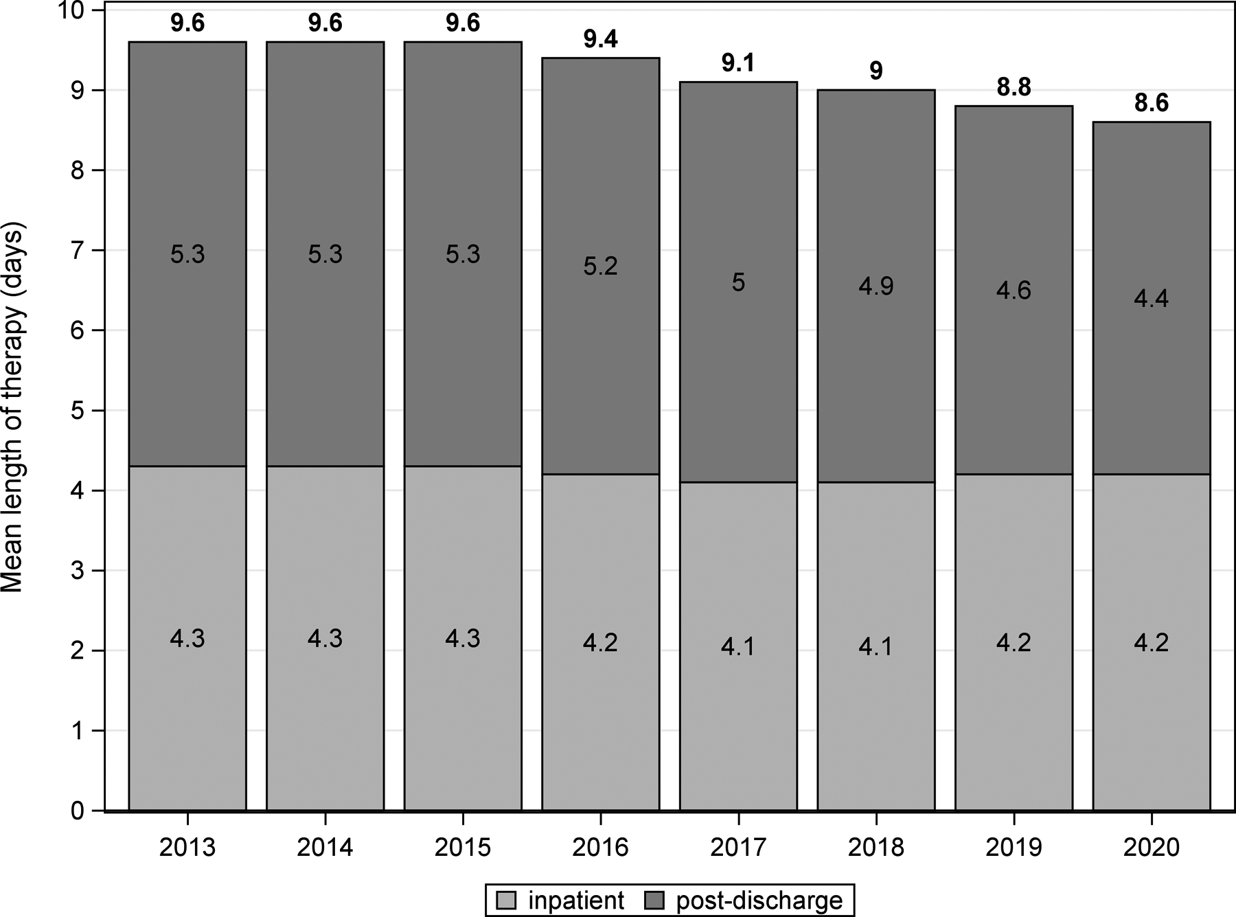 We conducted a retrospective cohort study among adults with a primary diagnosis of bacterial or unspecified pneumonia using International Classification of Diseases 9th and 10th revision codes in MarketScan® and Centers for Medicare & Medicaid Services databases. We included patients with length of stay (LOS) of 2–10 days, discharged home with self-care, and not re-hospitalized in the 3 days following discharge. We estimated inpatient LOT based on LOS from the PINC AI Healthcare Database. Total LOT was calculated by summing estimated inpatient LOT and actual post-discharge LOT. We examined trends from 2013–2020 in patients with total LOT >7 days, which was considered an indicator of likely excessive LOT.