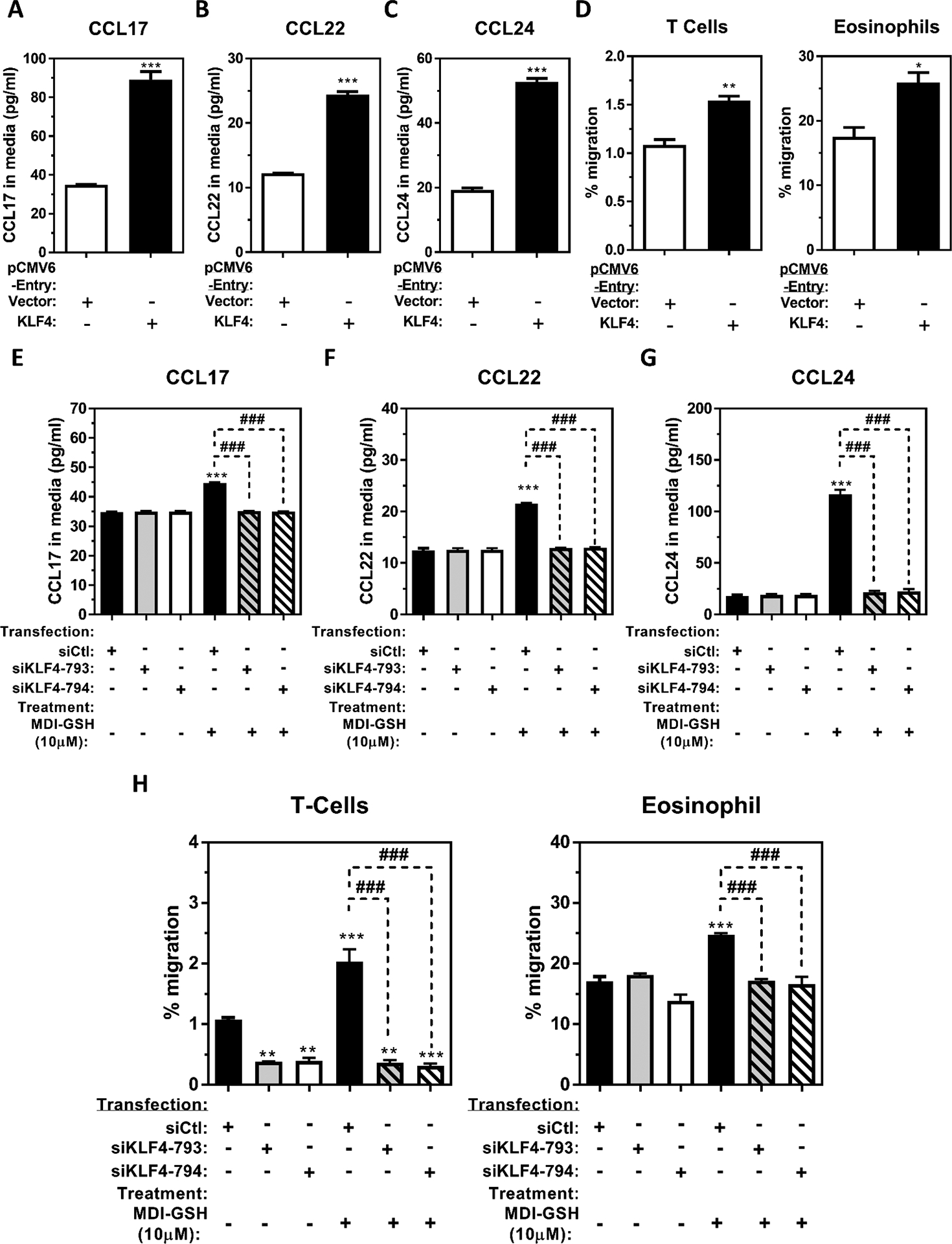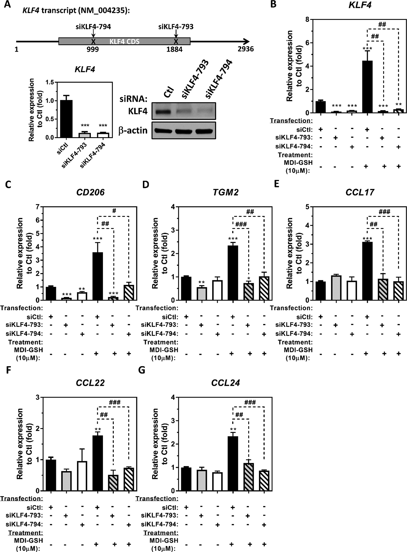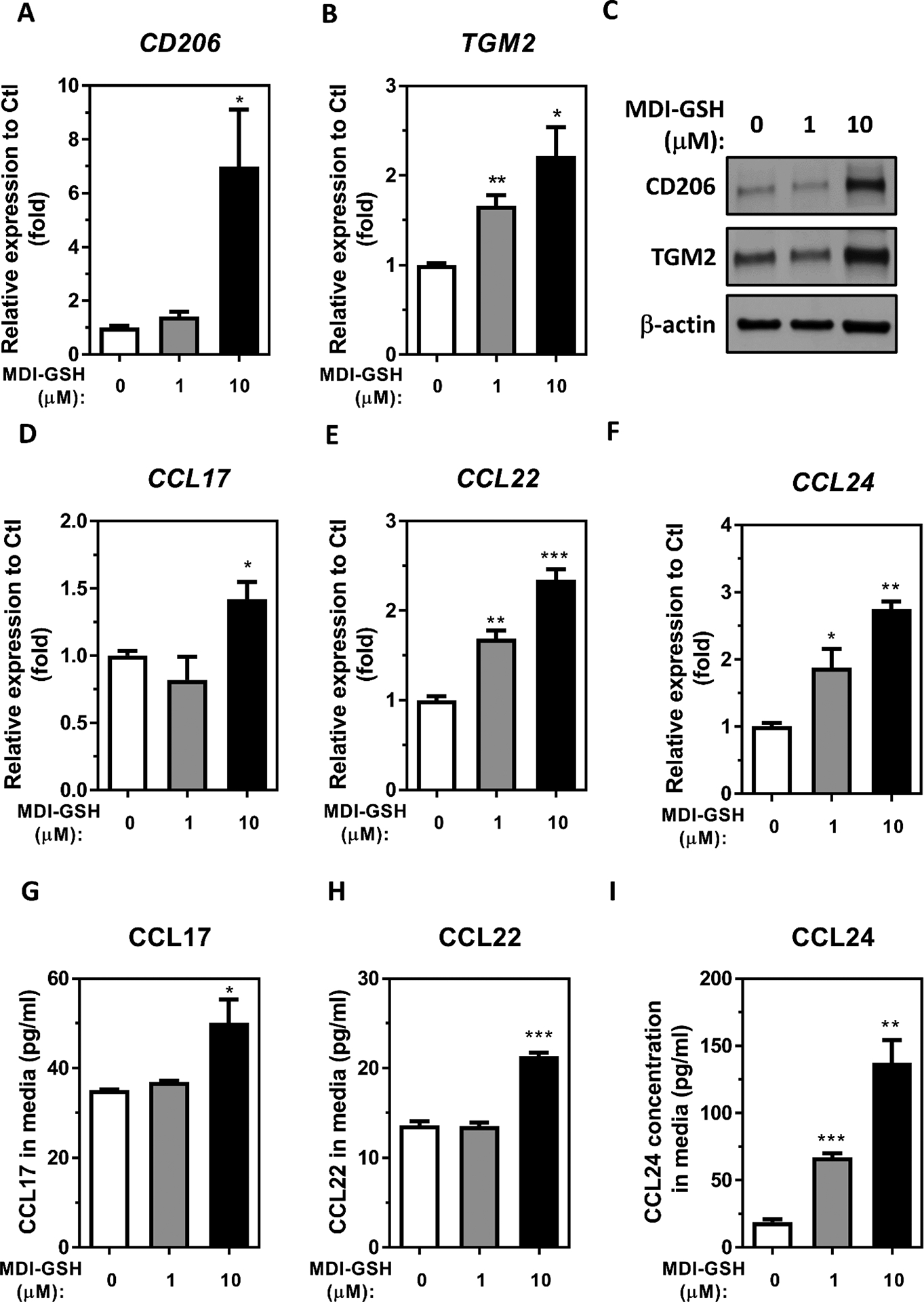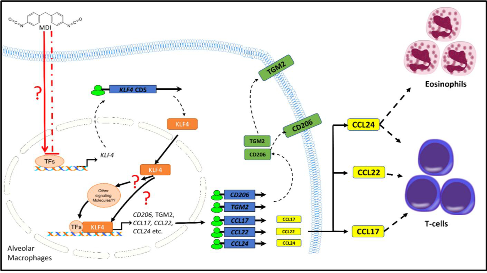 Description:Occupational exposure to the most widely used monomeric diisocyanate (dNCO), 4,4'-methylene diphenyl diisocyanate (MDI), may lead to the development of occupational asthma (OA). Alveolar macrophages with alternatively activated (M2) phenotype have been implicated in allergic airway responses and the pathogenesis of asthma. Recent | studies demonstrate that M2 macrophage-associated markers and chemokines are induced by MDI-exposure, however, the underlying molecular mechanism(s) by which this proceeds is unclear.Following MDI exposure (| and |) M2 macrophage-associated transcription factors (TFs), markers, and chemokines were determined by RT-qPCR, western blots, and ELISA.Expression of M2 macrophage-associated TFs and markers including |/KLF4, |/CD206, |/TGM2, |/CCL17, |/CCL22, and CCL24 were induced by MDI/MDI-GSH exposure in bronchoalveolar lavage cells (BALCs)/THP-1 macrophages. The expression of | and | are upregulated by 3.83-, 7.69-, 6.22-, 6.08-, and 1.90-fold in KLF4-overexpressed macrophages, respectively. Endogenous | and | were downregulated by 1.65-5.17-fold, and 1.15-1.78-fold, whereas | and | remain unchanged in KLF4-knockdown macrophages. Finally, MDI-glutathione (GSH) conjugate-treated macrophages show increased chemotactic ability to T-cells and eosinophils, which may be attenuated by KLF4 knockdown.Our data suggest that MDI exposure may induce M2 macrophage-associated markers partially through induction of KLF4.