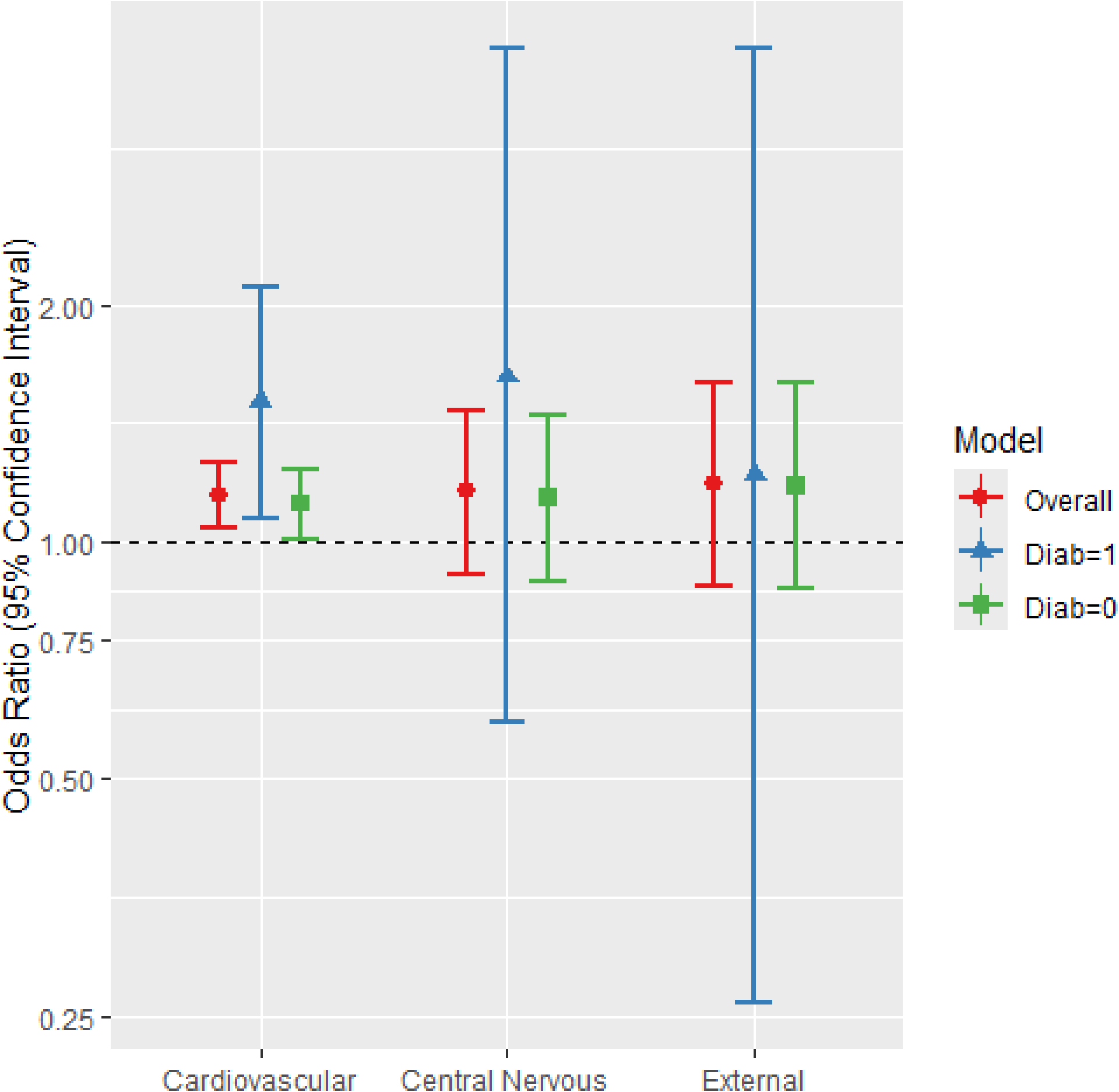 We observed positive associations between cardiovascular birth defects and residential proximity to Pb brownfields, OR (95%CI): 1.15 (1.04, 1.26), with suggestive positive associations for central nervous 1.16 (0.91, 1.47) and external defects 1.19 (0.88, 1.59). We did observe evidence of effect measure modification via likelihood ratio tests (LRT) for race/ethnicity for central nervous and external defect groups (LRT p-values 0.08 and 0.02). We did observe modification by diabetes status for the cardiovascular group (LRT p-value 0.08).