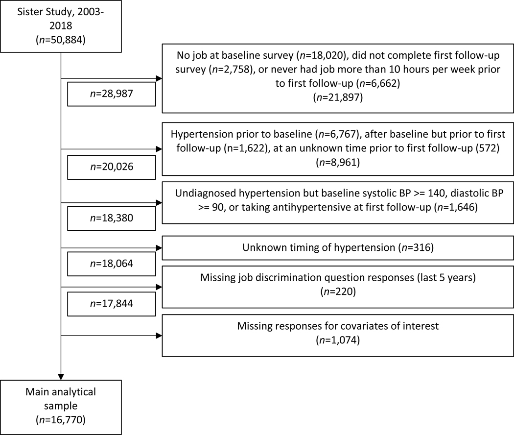 We used prospective cohort data from the Sister Study (enrollment from 2003–2009) to estimate self-reported incident hypertension associated with perceived job discrimination based on race, gender, age, sexual orientation, or health status. Job discrimination in the prior five years was assessed in 2008–2012, and incident doctor-diagnosed hypertension was ascertained in previously hypertension-free participants.