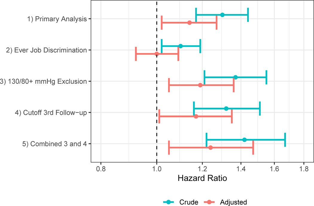 Among the 16,770 eligible participants aged 37 to 78 years at start of follow-up, 10.5% reported job discrimination in the past five years, and 19.2% (n=3,226) reported incident hypertension over a median follow-up of 9.7 years (interquartile range 8.2–11.0 years). Self-reported poor health or inclusion in minoritized groups based on race/ethnicity or sexual orientation were more frequent among those reporting job discrimination. In a Cox proportional hazards model adjusting for covariates, report of at least one type of job discrimination (compared to none) was associated with a 14% (HR=1.14 [95% CI: 1.02–1.27]) higher hypertension risk. Results from sensitivity analyses reinforced the findings.
