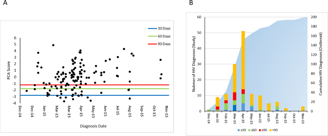 Plasma samples (n= 154) from a recent HIV-1 outbreak in a rural community in Indiana were tested with the customized HIV-1 Multiplex assay, based on the Bio-Rad Bio-Plex platform, which measures antibody response to HIV envelope antigens, gp120, gp160, and gp41. Assay cutoffs for each analyte were established to determine whether an individual seroconverted within 30, 60, or 90 days of the sample collection date. Additionally, a novel bioinformatics method was implemented to infer infection dates of persons newly diagnosed with HIV during the outbreak.