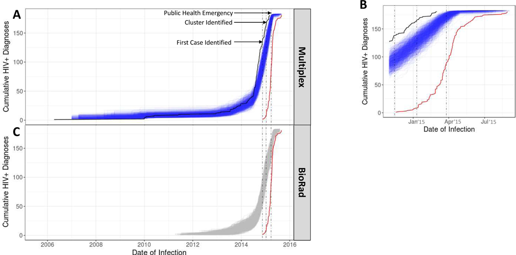 Sensitivity/specificity of the HIV-1 Multiplex assay for predicting seroconversion within 30, 60, 90 days, based on a training data set, was 90.5%/95.4%, 94.1%/90%, 89.4%/82.9%, respectively. Of 154 new diagnoses in Indiana between December 2014 and August 2016, the majority (71%) of recent infections (≤3 months since seroconversion) were identified between February and May 2016. The epidemiologic curve derived from the bioinformatics analysis indicated HIV transmission began as early as 2010, grew exponentially in 2014, and leveled off in April 2015.