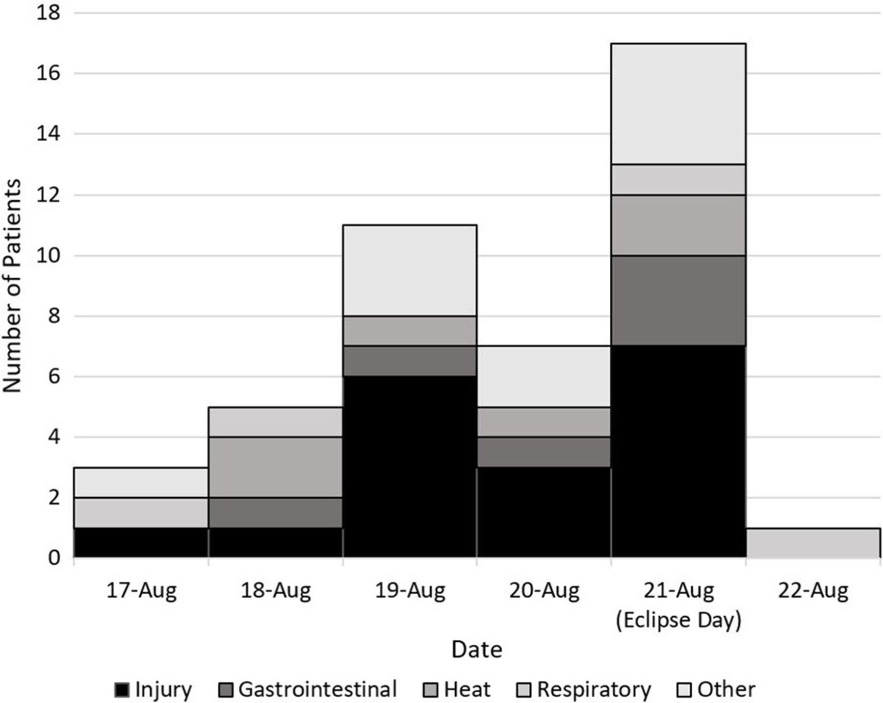 EDs flagged visits of patients who participated in eclipse events from August 17–22. Data from 14 area emergency medical services and 26 first-aid stations were also monitored to detect health-related events occurring during the eclipse period.