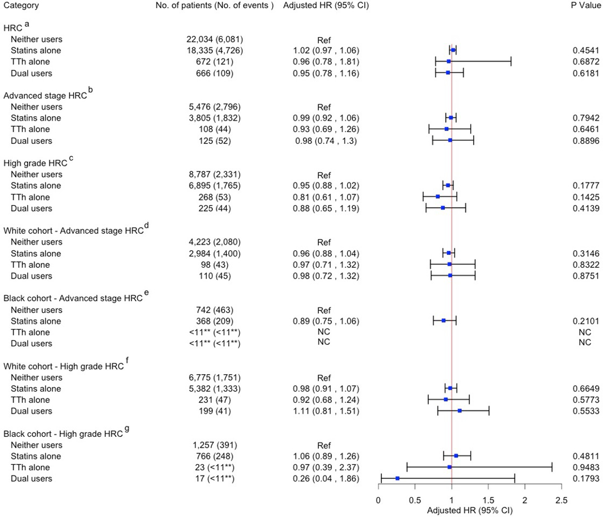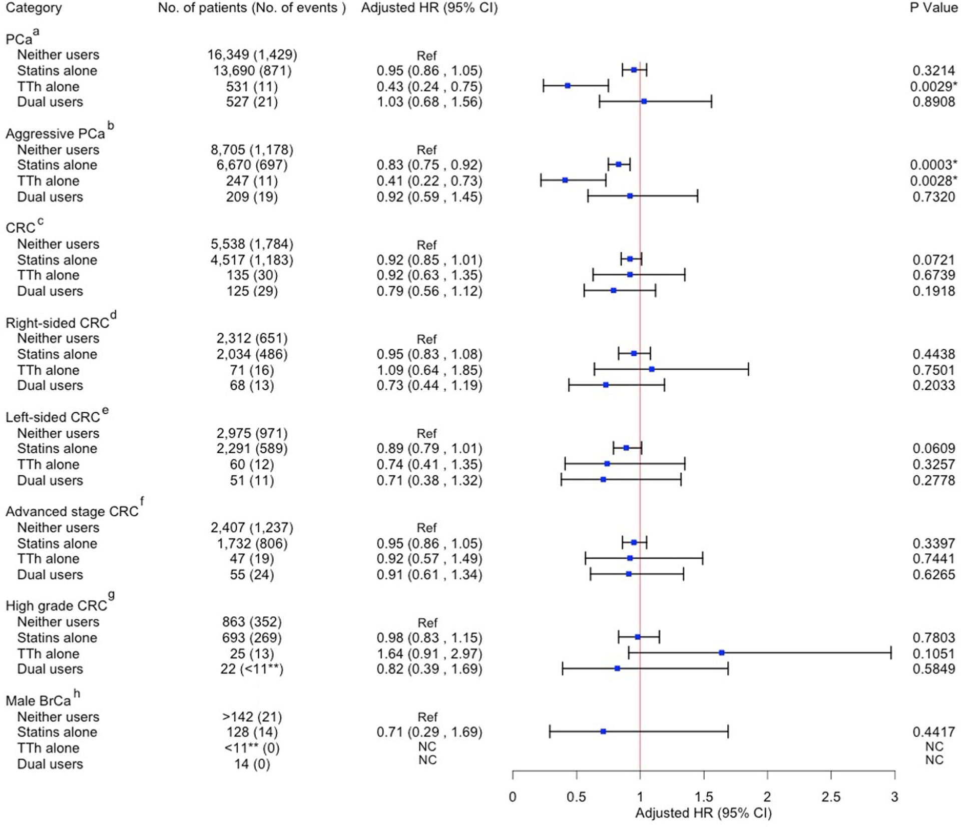 No significant associations were found in Cox-proportional hazard models for HRCs. However, in the Fine-Gray competing risk models among high grade HRCs, statins alone had an 11% reduced risk of HRC-specific death (HR: 0.89; 95% CI: 0.81–0.99; P: 0.0451). In the PCa cohort with both statistical models, use of TTh alone had a 24% lower risk of all-cause death (HR: 0.76; 95% CI: 0.59–0.97; P: 0.0325) and a 57% lower risk of PCa-specific death (HR: 0.43; 95% CI: 0.24–0.75; P: 0.0029). Similar inverse associations were found among aggressive PCa cases with TTh alone and statins alone. No significant associations were found in the CRC and male BrCa sub-groups.