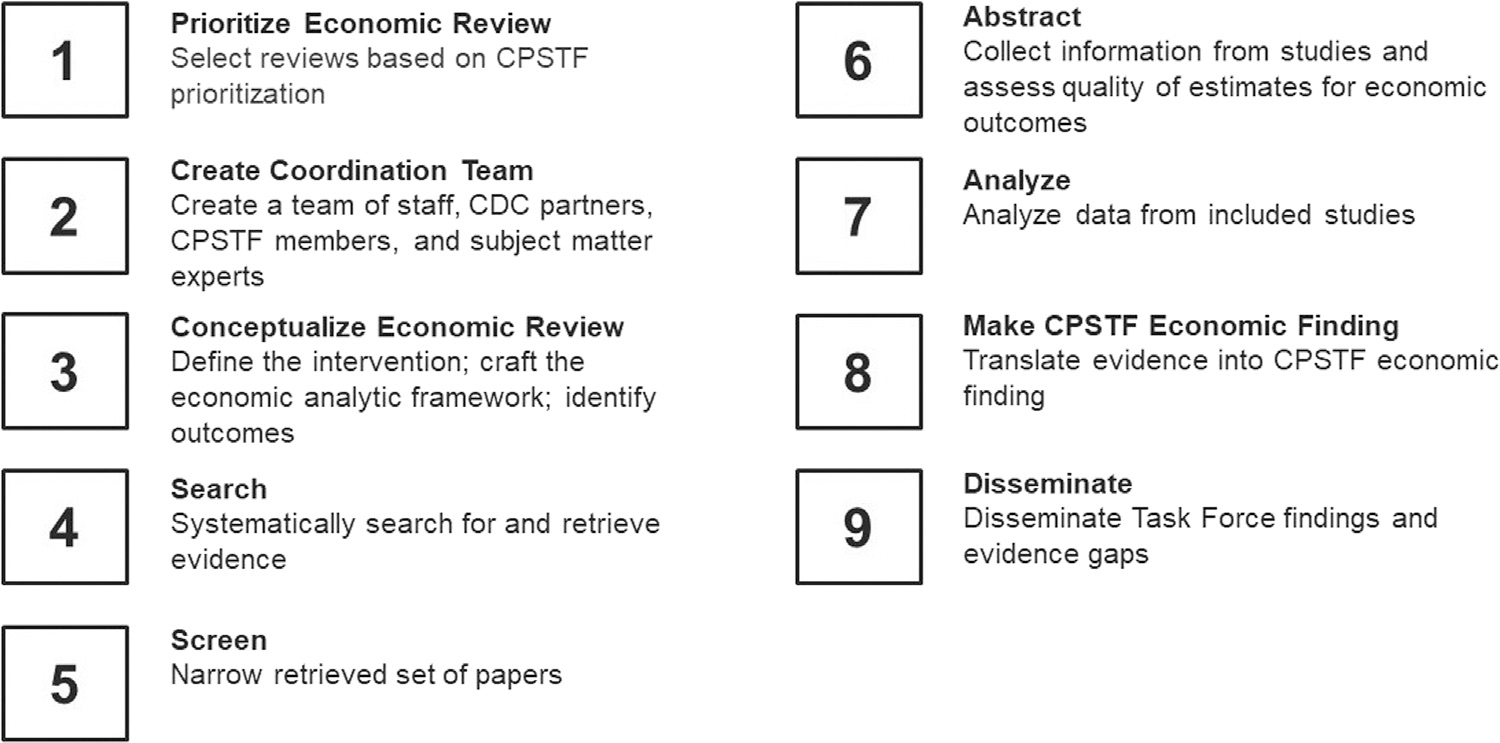 The 9-step Community Guide economic review process includes prioritization of topic, creation of a coordination team, conceptualization of review, literature search, screening studies for inclusion, abstraction of studies, analysis of results, translation of evidence to Community Preventive Services Task Force economic findings, and dissemination of findings and evidence gaps. The methods applied in each of these steps are reported in this paper.