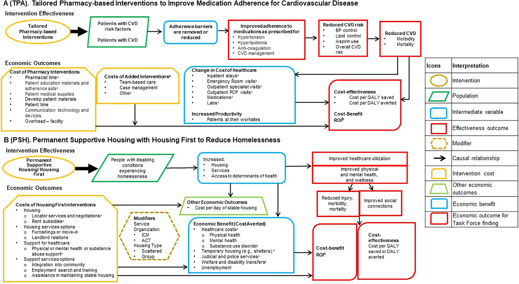 Two published Community Guide reviews, tailored pharmacy-based interventions to improve adherence to medications for cardiovascular disease and permanent supportive housing with housing first to prevent homelessness, are used to illustrate the application of the updated methods. The Community Preventive Services Task Force reached a finding of cost-effectiveness for the first intervention and a finding of favorable cost-benefit for the second on the basis of results from the economic reviews.
