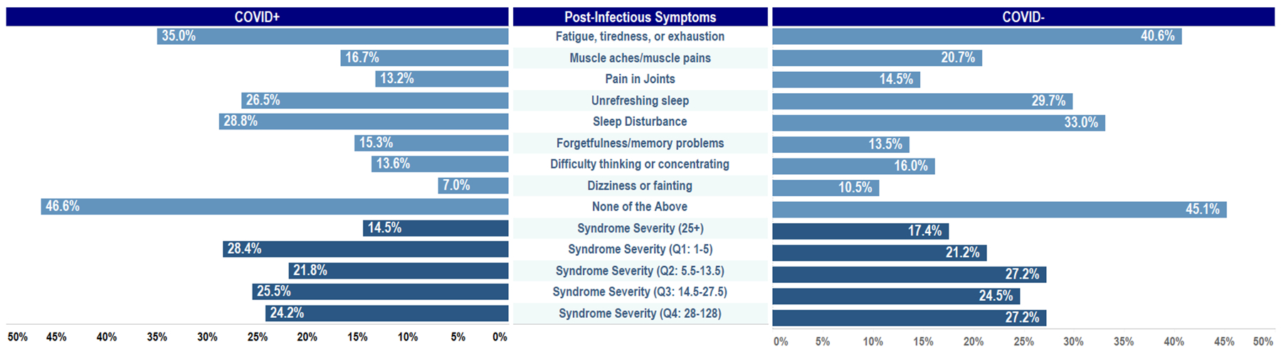 We conducted a prospective cohort study comparing adults with SARS-CoV-2 infection (COVID+) with adults who tested negative (COVID−), enrolled within 28 days of an FDA-approved SARS-CoV2 test result for active symptoms. Sociodemographic characteristics, symptoms of SARS-CoV-2 infection (assessed with the CDC Person Under Investigation Symptom List), and symptoms of post-infectious syndromes (i.e., fatigue, sleep quality, muscle/joint pains, unrefreshing sleep, and dizziness/fainting, assessed with CDC Short Symptom Screener for myalgic encephalomyelitis/chronic fatigue syndrome) were assessed at baseline and 3 months via electronic surveys sent via text or email.