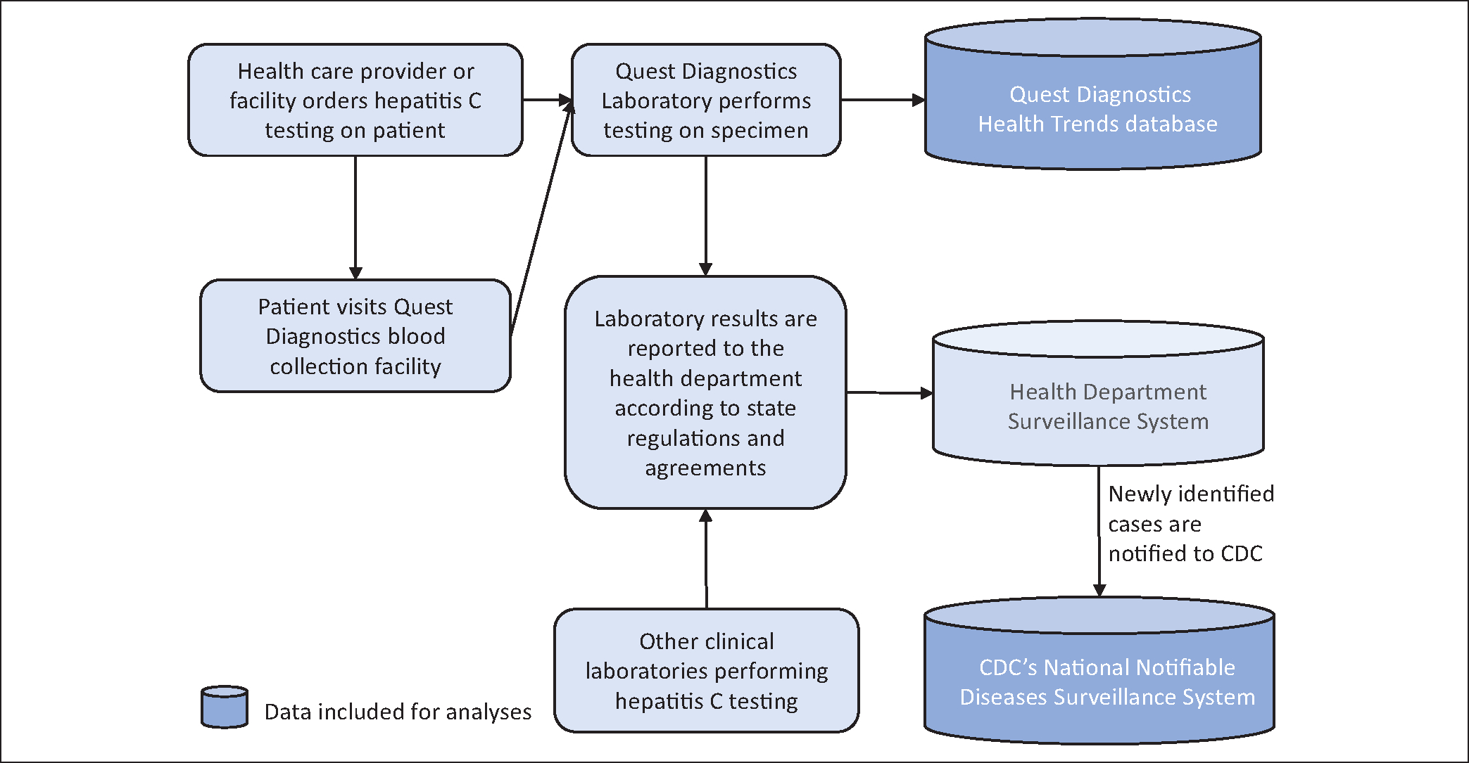 We used Quest Diagnostics data from 2013–2021 to assess trends in the numbers tested for HCV antibody and proportion of positivity for HCV antibody and HCV RNA. We also assessed National Notifiable Diseases Surveillance System 2013–2020 data for trends in the number and proportion of hepatitis C cases. We applied joinpoint regression for trends testing.