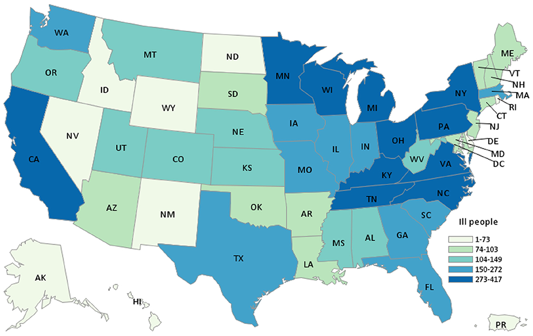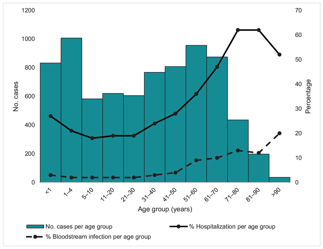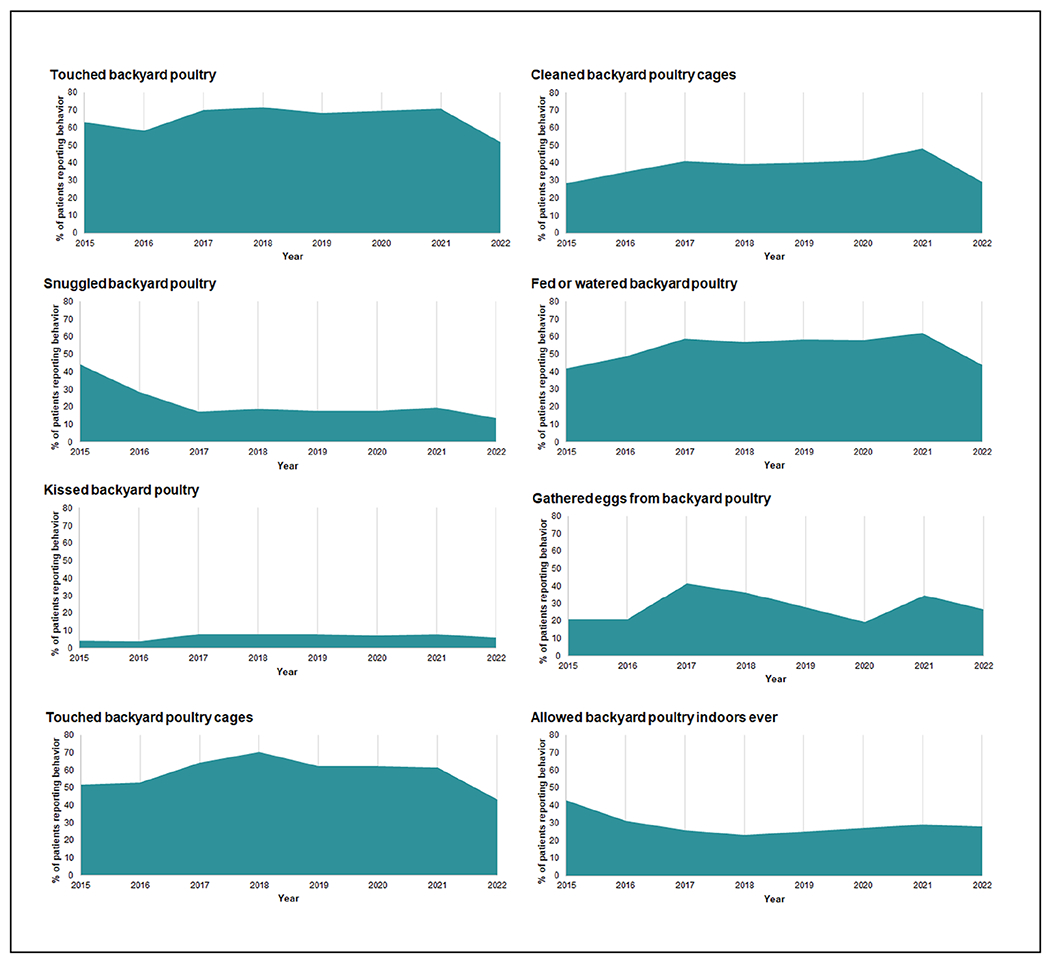 During 2015–2022, there were 88 multistate backyard poultry-associated salmonellosis outbreaks and 7866 outbreak-associated illnesses caused by 21 different Salmonella serotypes. Salmonella Enteritidis accounted for the most outbreaks (n = 21) and illnesses (n = 2400) of any serotype. Twenty-four percent (1840/7727) of patients with available information were <5 years of age. In total, 30% (1710/5644) of patients were hospitalized, and nine deaths were attributed to Salmonella infection. Throughout this period, patients reported behaviours that have a higher risk of Salmonella transmission, including kissing or snuggling poultry or allowing poultry inside their home.