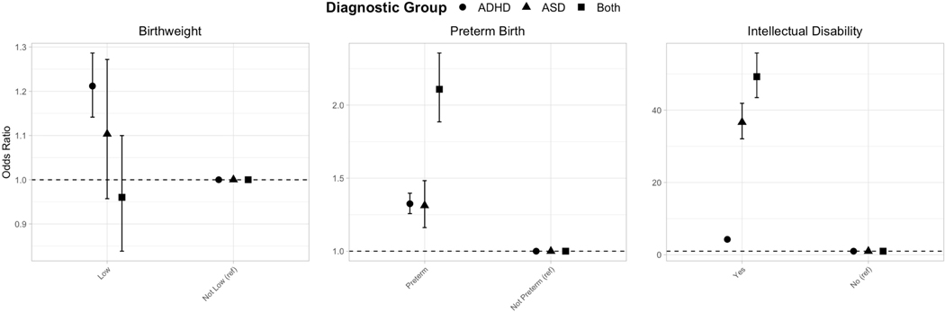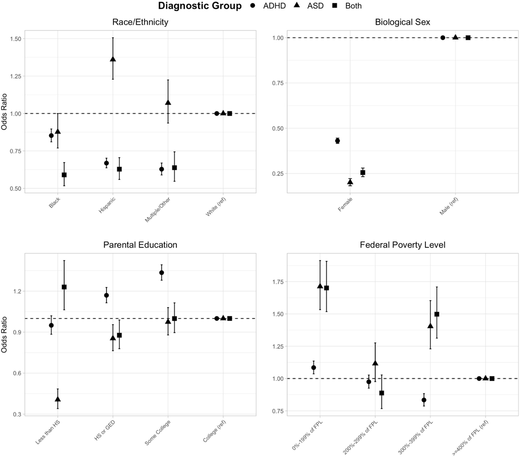 Sociodemographic variables were differentially related to the three diagnostic groups: ASD-only, ADHD-only, and ASD+ADHD. Compared to girls, boys experienced higher odds of all three diagnosis categories. White children had higher odds of having an ADHD-only or ASD+ADHD diagnosis compared to Non-Hispanic (NH) Black, NH multiple/other race, and Hispanic children. Odds ratios for levels of parent education, household income, and birth characteristics showed varying trends across diagnostic groups.