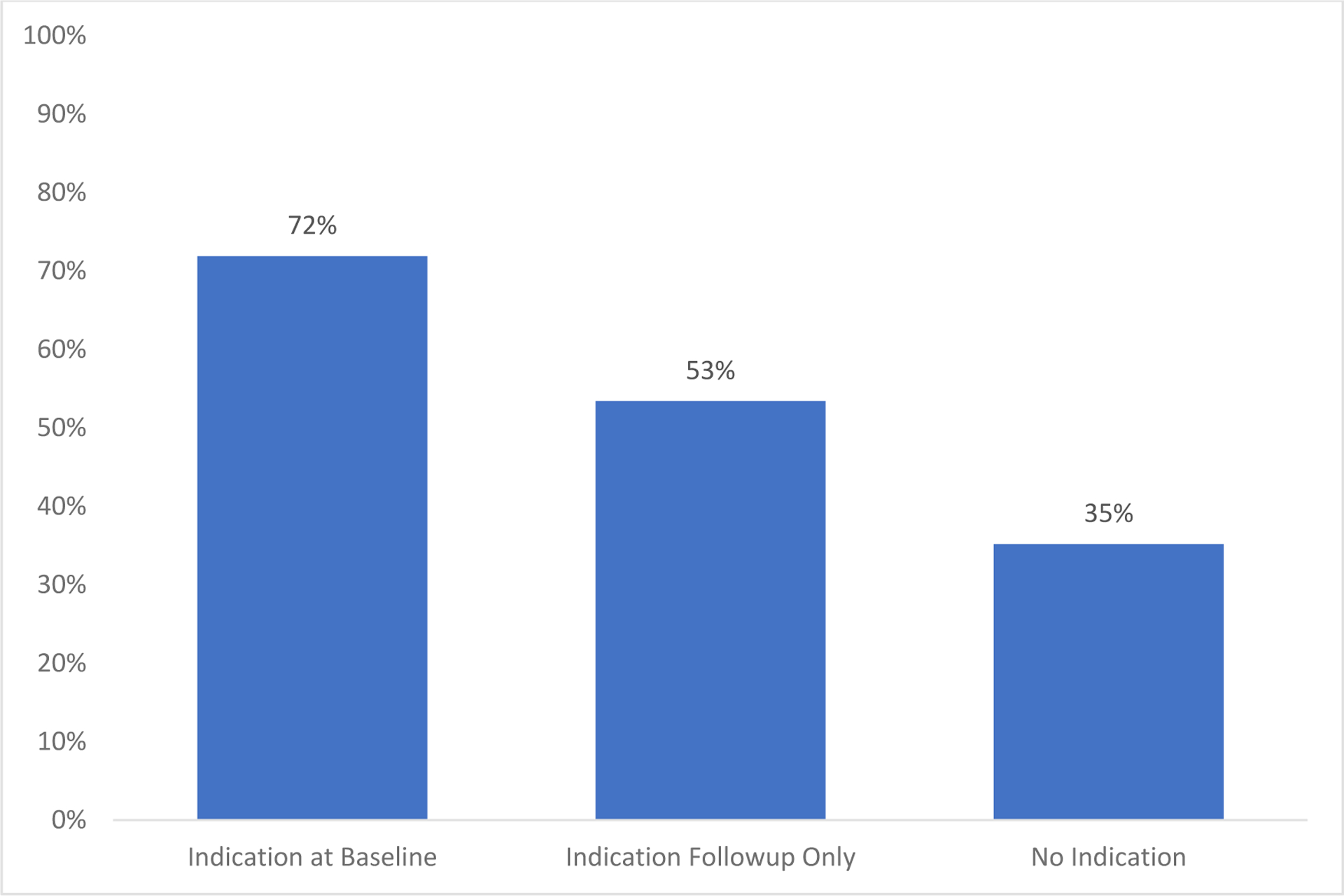 47.4% had indications for genetic testing at any time: 28.0% at baseline and an additional 19.4% at time of the follow-up survey (FUPs only); 71.9% (95% CI 67.4%−76.4%) of those with a baseline indication reported genetic testing vs. 53.3% (95% CI 47.3% - 59.2%) with an indication at FUPs only and 35.0% (95% CI 31.6% - 38.4%) with no indication (p<.001). There were no significant racial or ethnic differences in receipt of testing, controlling for age and clinical indications (p=0.239); results for genetic counseling were similar. Only 3.4% of survivors had direct-to-consumer testing (DTCt) for cancer. Testers who reported a pathogenic variant (n=62) were much more likely to have talked to most or all their first-degree adult relatives about genetic testing than those with a variant of unknown significance (n=49) or a negative finding (n=419): 62.7% vs 38.8% and 38.0%, respectively (p<.001).