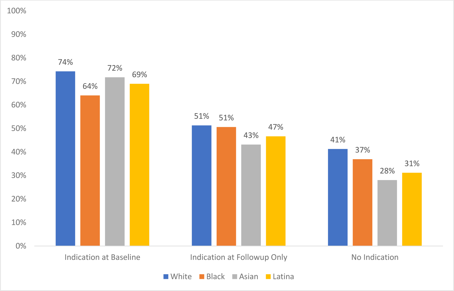 Women aged 20–79 diagnosed with early-stage breast cancer in 2014–2015 and reported to the Georgia and Los Angeles County SEER registries were surveyed approximately seven months and six years after diagnosis (N=1412). We asked about genetic counseling, testing, and communication with relatives about results. We categorized women into indications for testing based on clinical guidelines at time of diagnosis and at the time of the follow-up survey.
