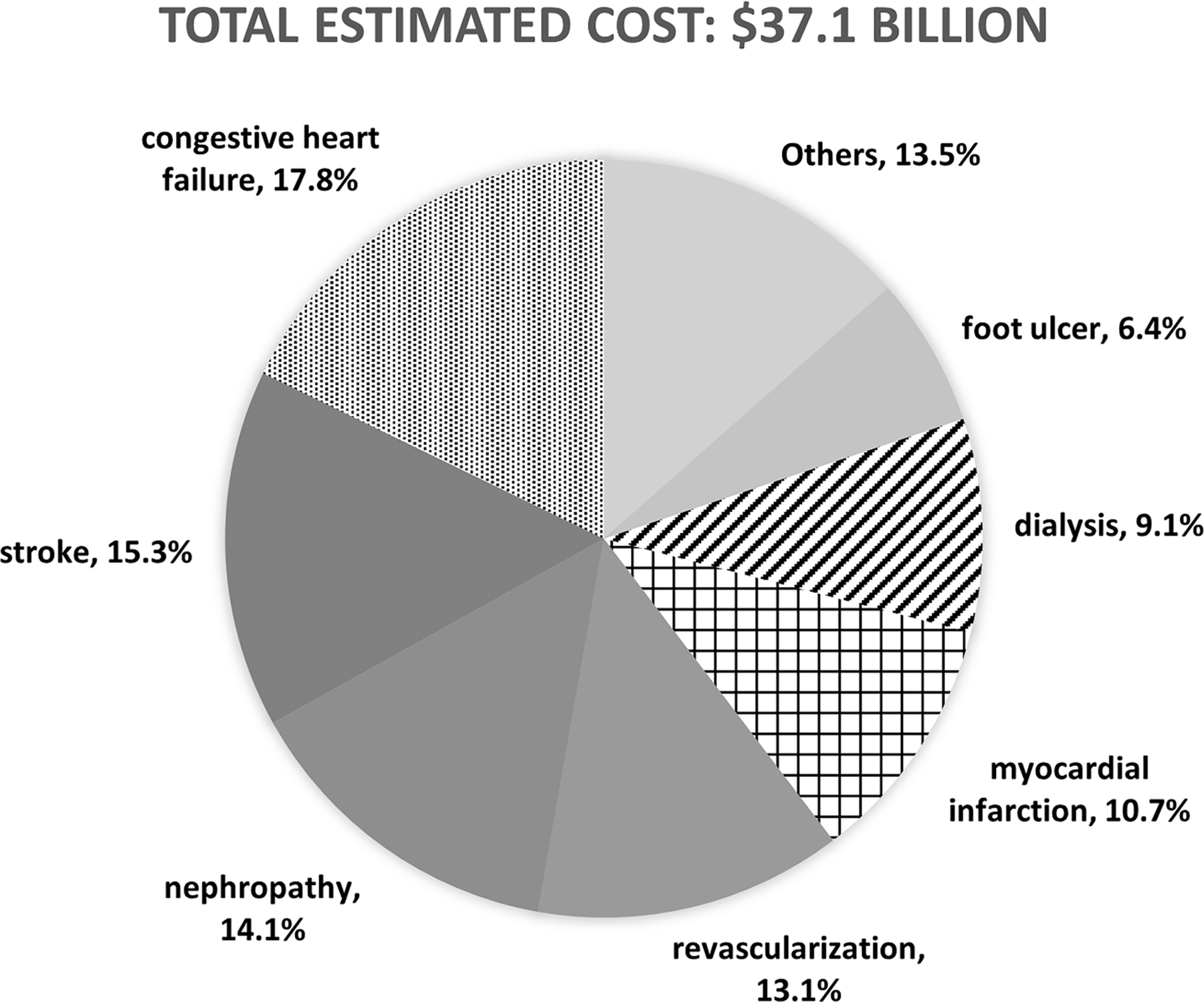 Claims data from 100% of Medicare beneficiaries enrolled in fee-for-service plans from 2006 to 2017 were analyzed. Records with type 2 diabetes and complications were identified using ICD-9, ICD-10, and diagnosis-related group codes. The index year was the year when a person was first identified as having diabetes with an inpatient claim or an outpatient claim plus another inpatient/outpatient claim in the 2 years following the first claim in Medicare. Included individuals were followed from index years until death, discontinuation of plan coverage, or 31 December 2017. Fixed-effects regression was used to estimate the cost in years when the complication event occurred and in subsequent years. The total cost for each complication was calculated for 2017 by multiplying the complication prevalence by the cost estimate. All costs were standardized to 2017 U.S. dollars.
