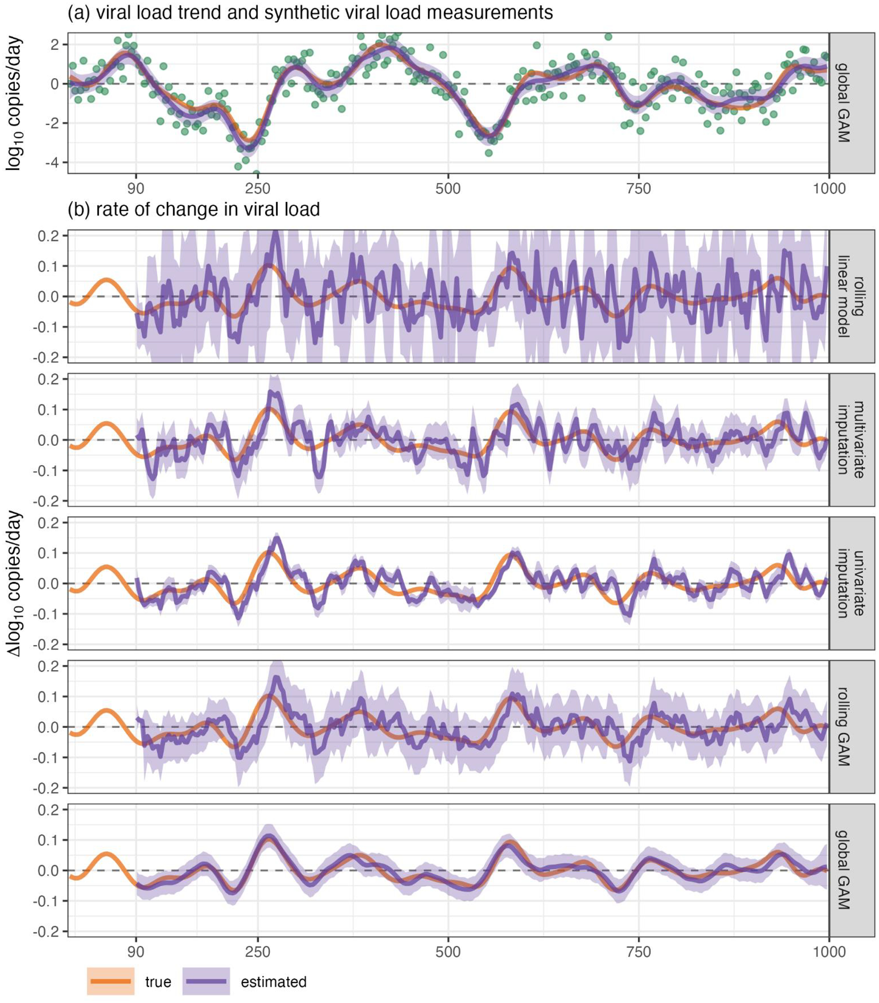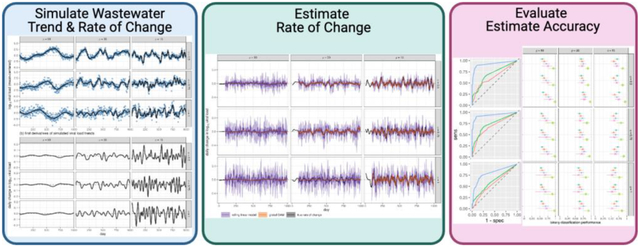 We assessed the performance of approaches for estimating rates of change in wastewater pathogen loads by generating synthetic wastewater time series data for which rates of change were known. Each approach was also evaluated on real-world data.