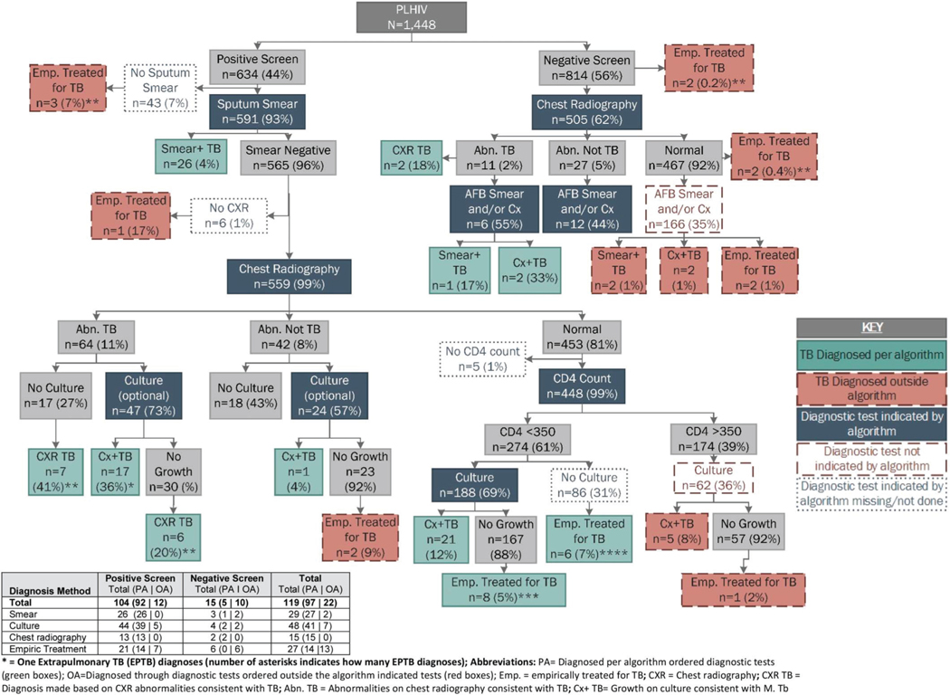 We implemented an algorithm to diagnose or rule out TB among PLHIV in 11 HIV clinics in Thailand and Vietnam. We assessed algorithm yield and uptake of IPT and factors associated with TB disease among PLHIV.
