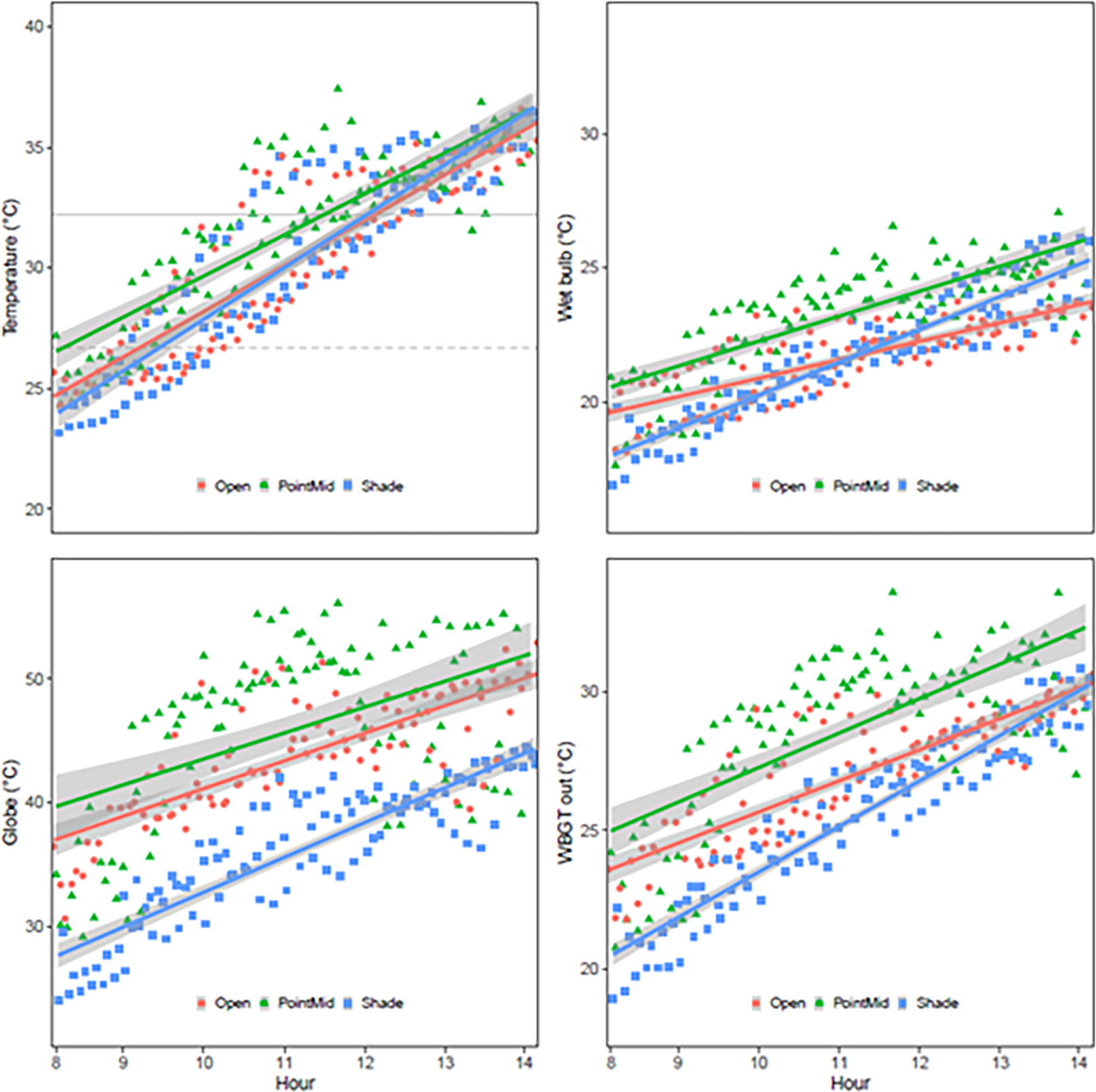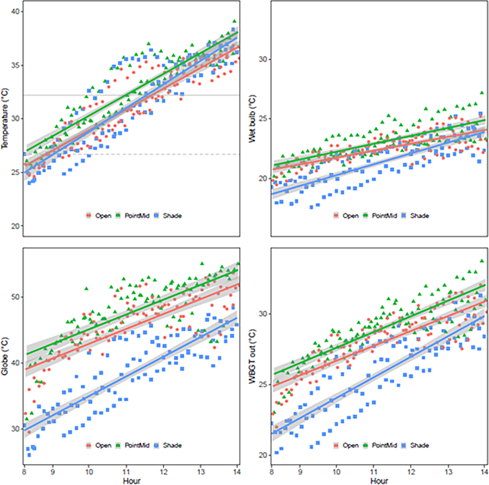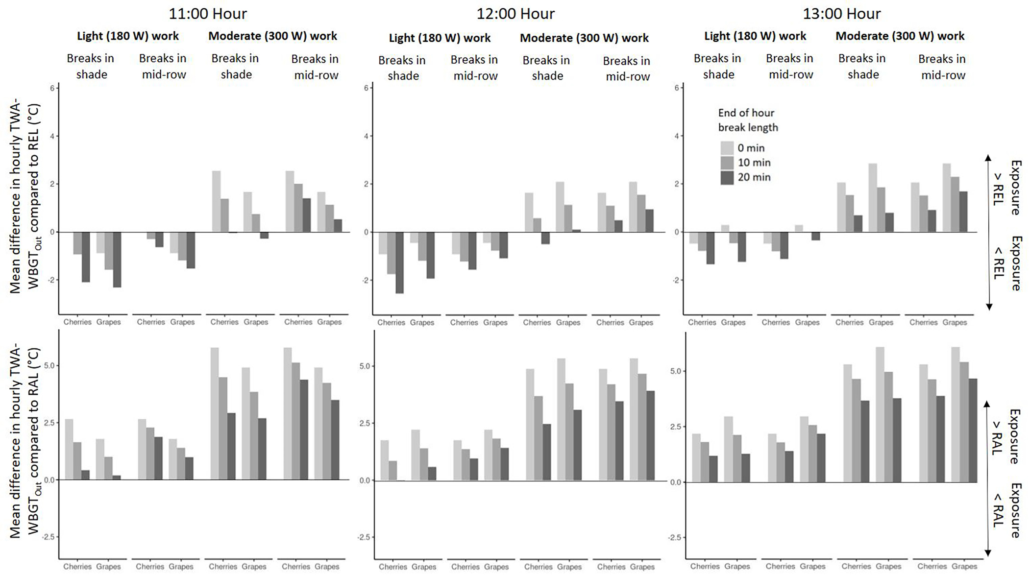 Across all crops and locations during the study period, the mean/SD air temperature was 31°C(88°F)/3.9°C(6.9°F), with a maximum temperature of 39°C(102°F) and a mean/SD relative humidity of 30%/9.6%. LMER models suggested no significant difference in mid-row versus open WBGT but significantly lower WBGT in shade versus open locations for both cherries (main effect −5.14: 95% confidence interval [CI] −6.97,−3.32) and grapes (−6.20: 95%CI −7.73,−4.67), though this difference diminished over the course of the day. BGT was significantly higher in the mid-row than the shade (cherries main effect 14.33: 95%CI 9.52,19.13 and grapes 17.10: 95%CI 13.44,20.75). During the hottest sampling hour, exceedances of OELs were reduced with assumptions of increased shaded break lengths, reduced effort level, and acclimatization.