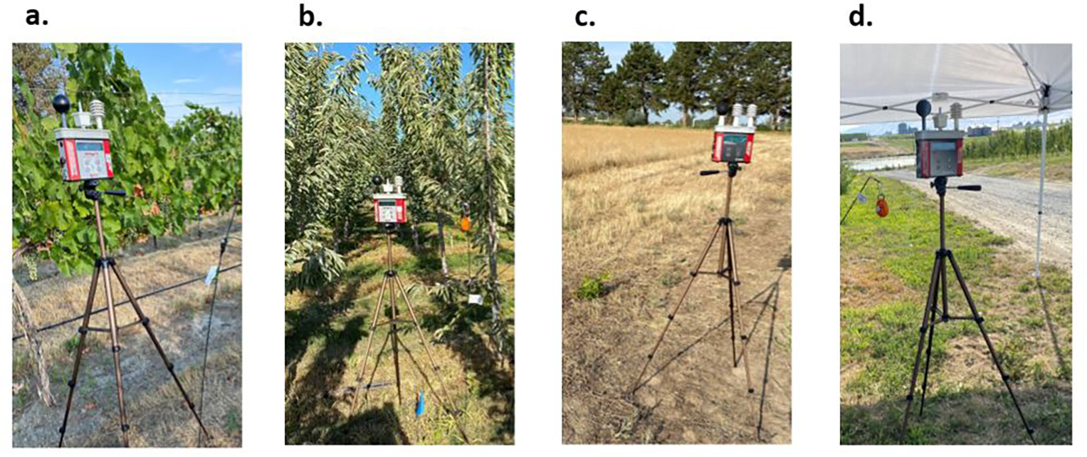 We assessed heat exposure in Eastern Washington State (WA) cherry and grape fields in August 2022. QUESTemp° monitors recorded Wet Bulb Globe Temperature (WBGT) and Black Globe Temperature (BGT) every 10 minutes from approximately 07:00–14:00 for 3 days in the center of crop rows (mid-row), under portable shade structures (shade), and in open field (open) locations. Linear mixed effects regression (LMER) models compared WBGT and BGT among field locations. Hourly time-weighted average WBGT and comparisons with occupational exposure limits (OELs) were computed for different hypothetical work-rest cycles, assuming different worker effort levels, rest locations (mid-row versus shade), and acclimatization statuses, during the hottest sampling hours.