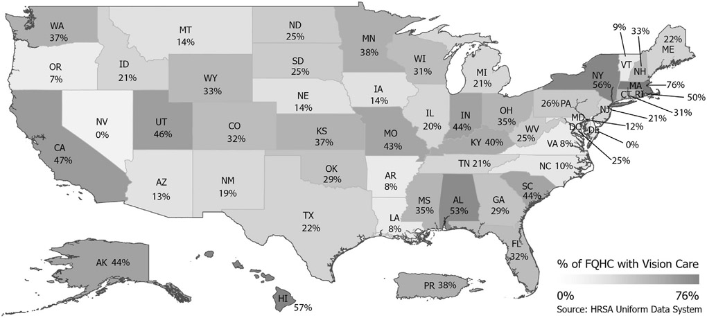 Vision care services are available at a few FQHCs, localized to a few states. Expanding eye care access at FQHCs would meet patients where they seek care to mitigate vision loss to underserved communities.