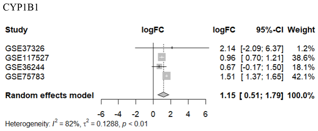 The meta-analysis revealed significant upregulation of CYP1B1 (log FC = 1.15, 95% CI: 0.51-1.79, P < 0.05, I2 = 82%) and ASB2 (log FC = 0.44, 95% CI: 0.20-0.67, P < 0.05, I2 = 40%) in response to B[a]P exposure. Pathway analyses identified 26 significantly regulated pathways, with the top including Aryl Hydrocarbon Receptor Signaling (P = 0.00214) and Xenobiotic Metabolism Signaling (P = 0.00550). Key genes CYP1A1, CYP1B1, and CDKN1A were implicated in multiple pathways, highlighting their roles in xenobiotic metabolism, oxidative stress response, and cell cycle regulation.