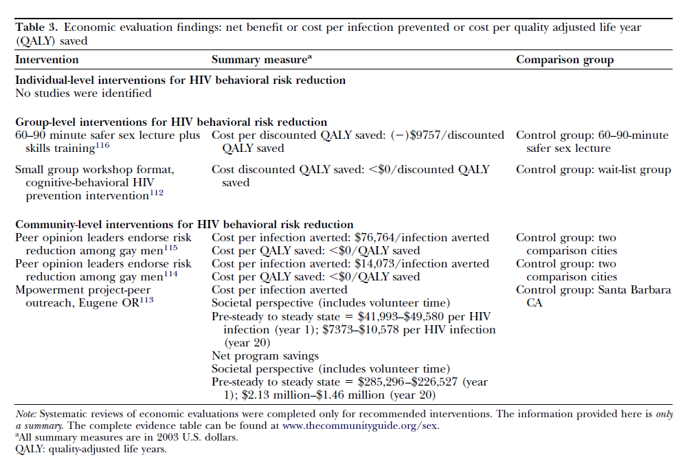Description:The Community Preventive Services Task Force (CPSTF) findings and recommendations for "Interventions to Reduce Sexual Risk Behaviors or Increase Protective Behaviors to Prevent Acquisition of HIV in Men Who Have Sex with Men: Individual-, Group-, and Community-Level Behavioral Interventions" are based on systematic reviews of evidence of effectiveness and economic impact. All CPSTF findings and recommendations were originally published in The Community Guide.