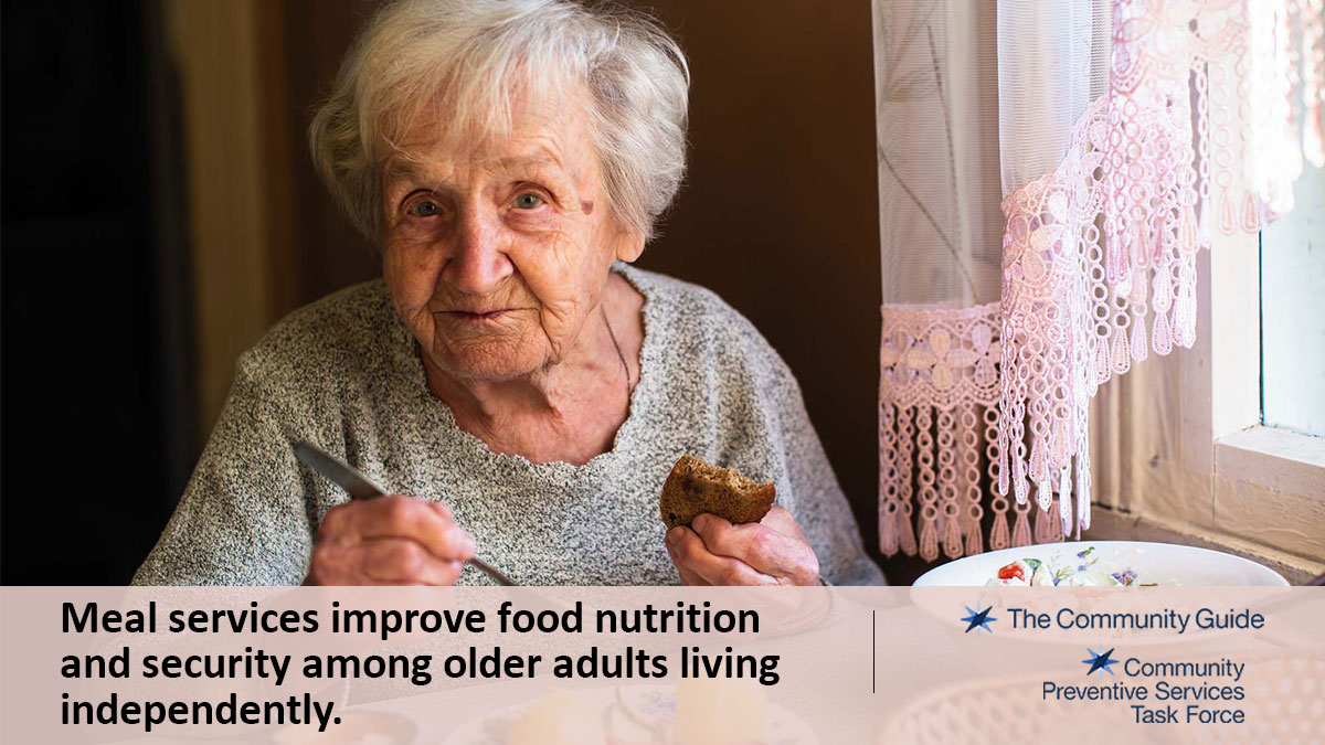 Description:The Community Preventive Services Task Force (CPSTF) findings and recommendations for "Nutrition, Physical Activity, and Obesity: Effectiveness of Home-delivered and Congregate Meal Services for Older Adults " are based on systematic reviews of evidence of effectiveness and economic impact. All CPSTF findings and recommendations were originally published in The Community Guide.