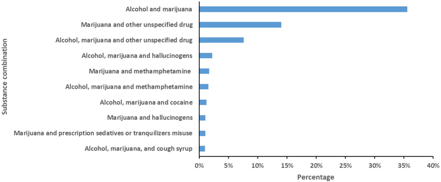Among 5,377 assessments, most were male (58.7%), aged 16–18 years (50.5%), non-Hispanic White (43.1%), enrolled in school (87.3%), and living with their parent(s) (72.4%). The most commonly reported lifetime substances used were marijuana (68.0%), alcohol (54.2%), and prescription opioid misuse (13.6%). The most common past 30-day substance use combination was alcohol and marijuana (35.6%). The percentage of assessments indicating past-year overdoses or hospital visits due to drug/alcohol use was greatest among those who reported lifetime use of IMF (24.0%), followed by heroin (21.4%) and cocaine (15.3%). Overall, 2.3% reported lifetime IMF use and 0.6% thought IMF was causing them the most problems.