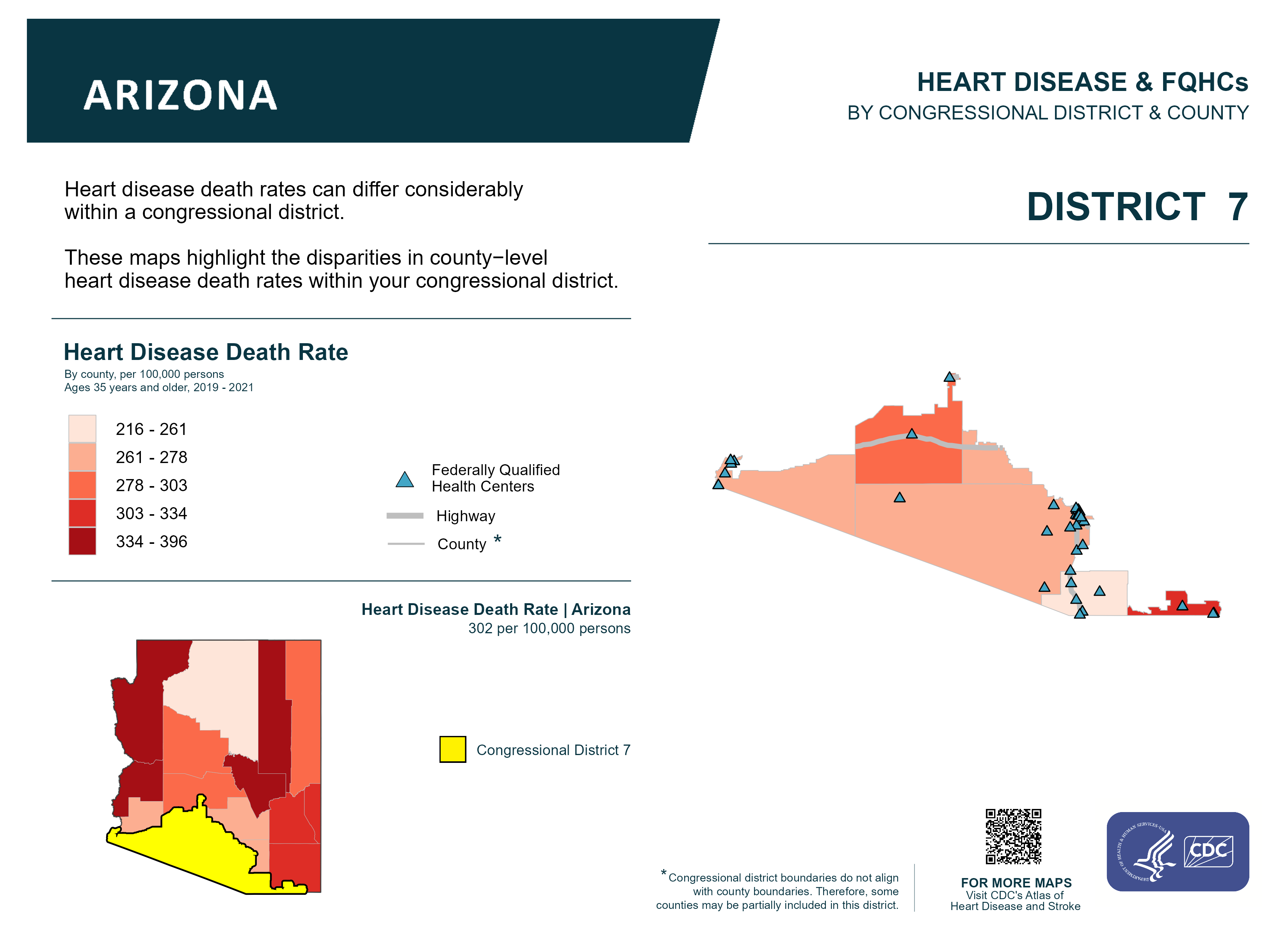 Description:Heart disease death rates can differ considerably within a congressional district. These maps highlight the disparities in county-level heart disease death rates within your congressional district. This map represents data for Arizona Congressional District 07.