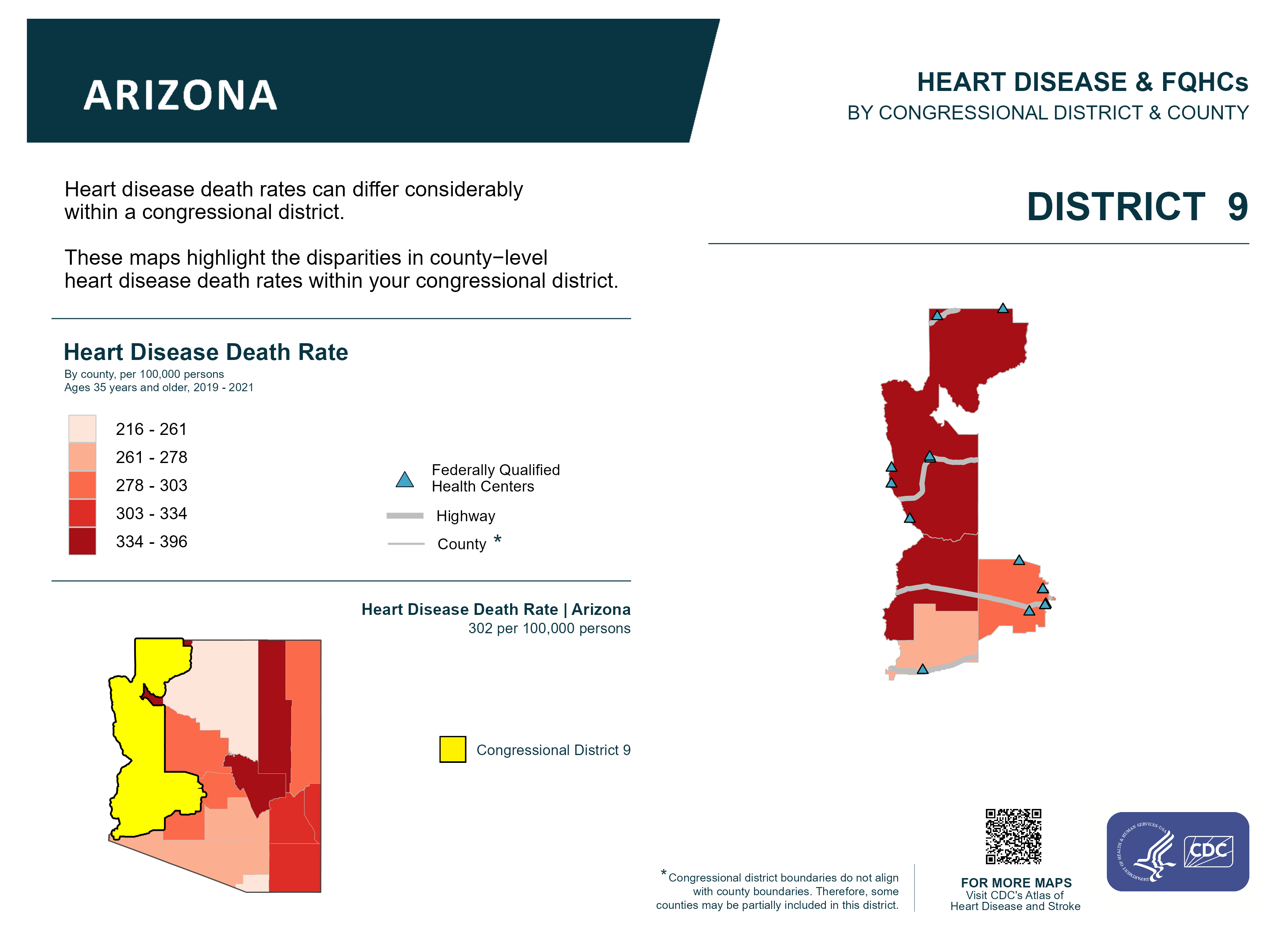 AZ: Congressional District 09, Heart Disease and Federally Qualified Health Centers Map [118th Congress]