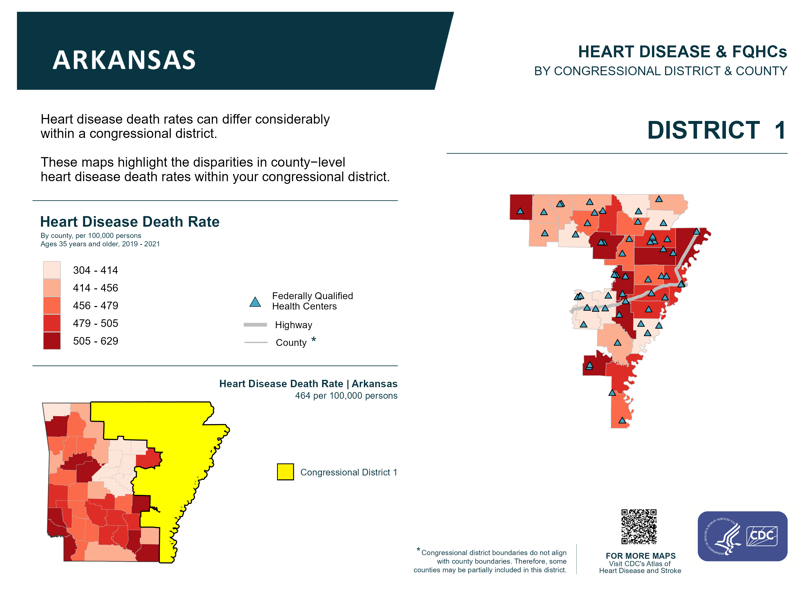 AR: Congressional District 01, Heart Disease and Federally Qualified Health Centers Map [118th Congress]
