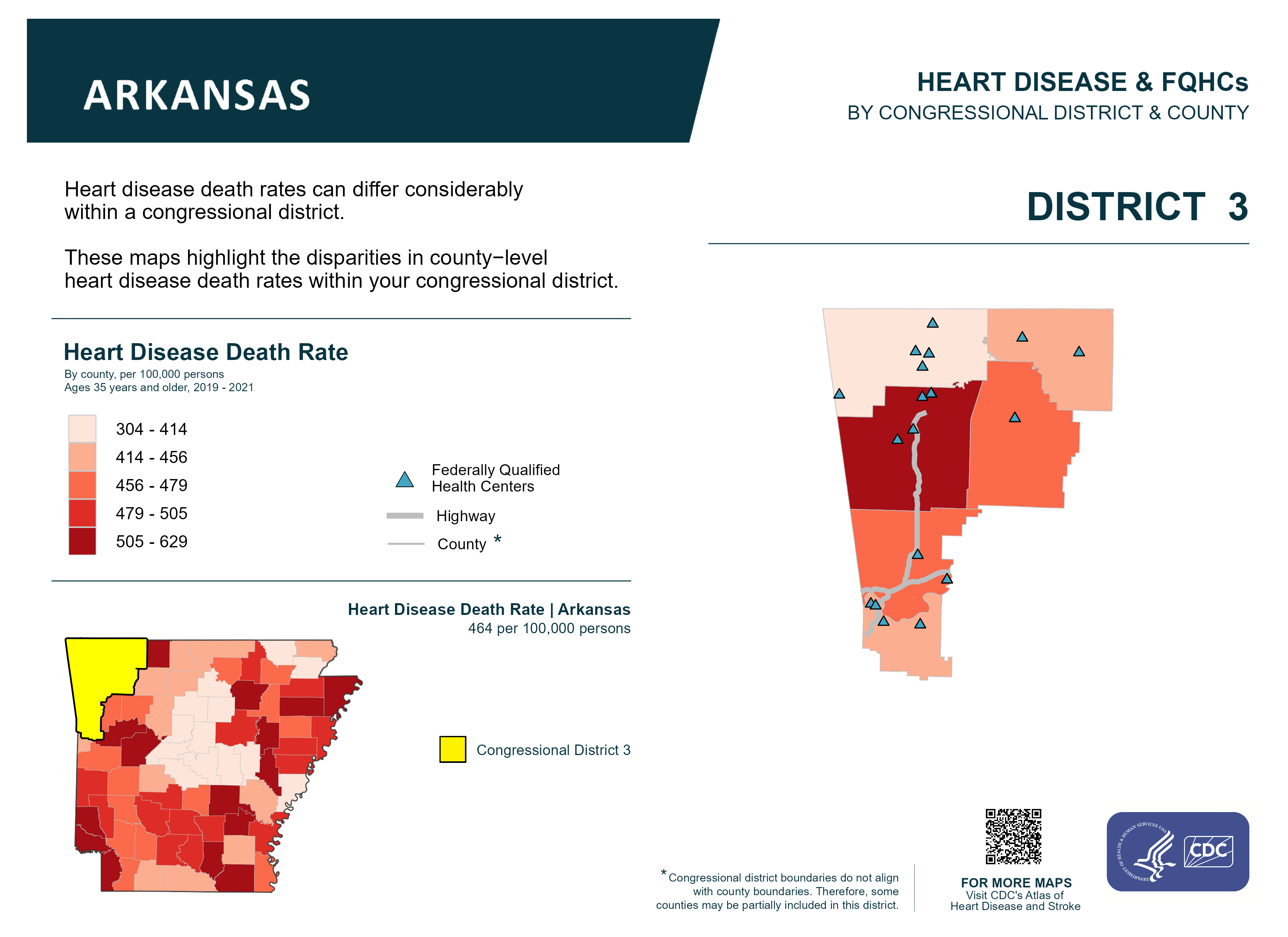AR: Congressional District 03, Heart Disease and Federally Qualified Health Centers Map [118th Congress]