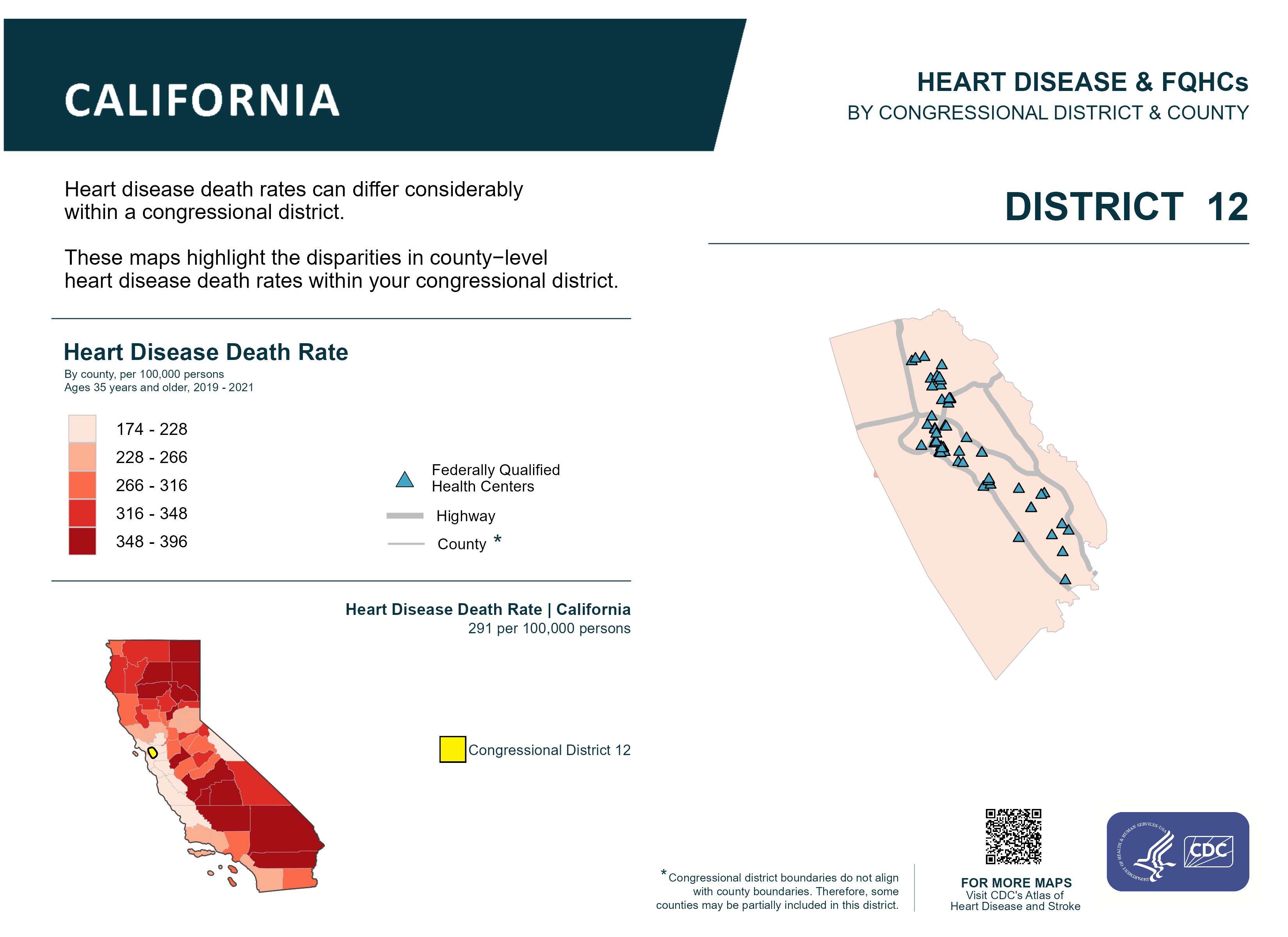 CA: Congressional District 12, Heart Disease and Federally Qualified Health Centers Map [118th Congress]
