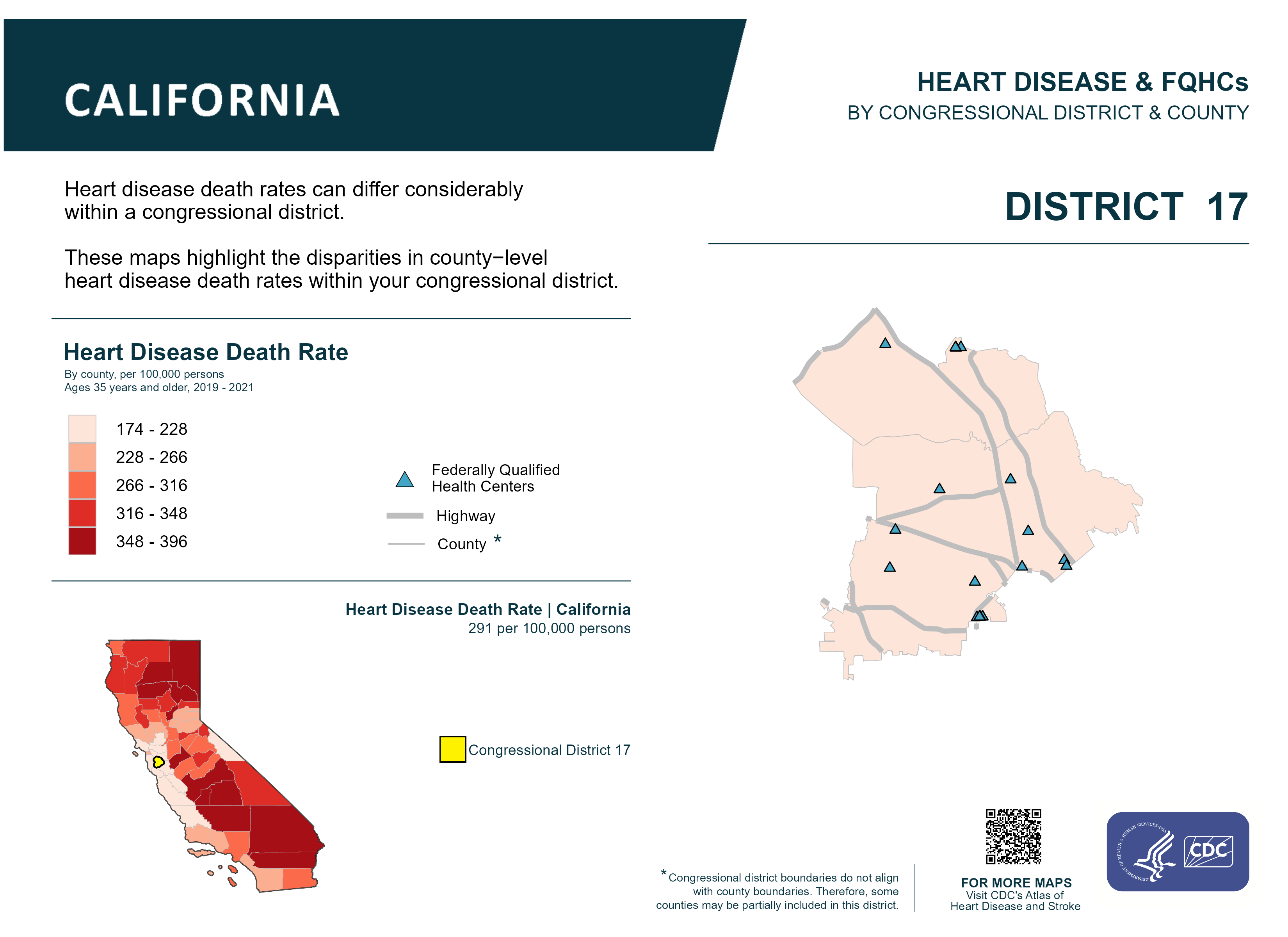 CA: Congressional District 17, Heart Disease and Federally Qualified Health Centers Map [118th Congress]