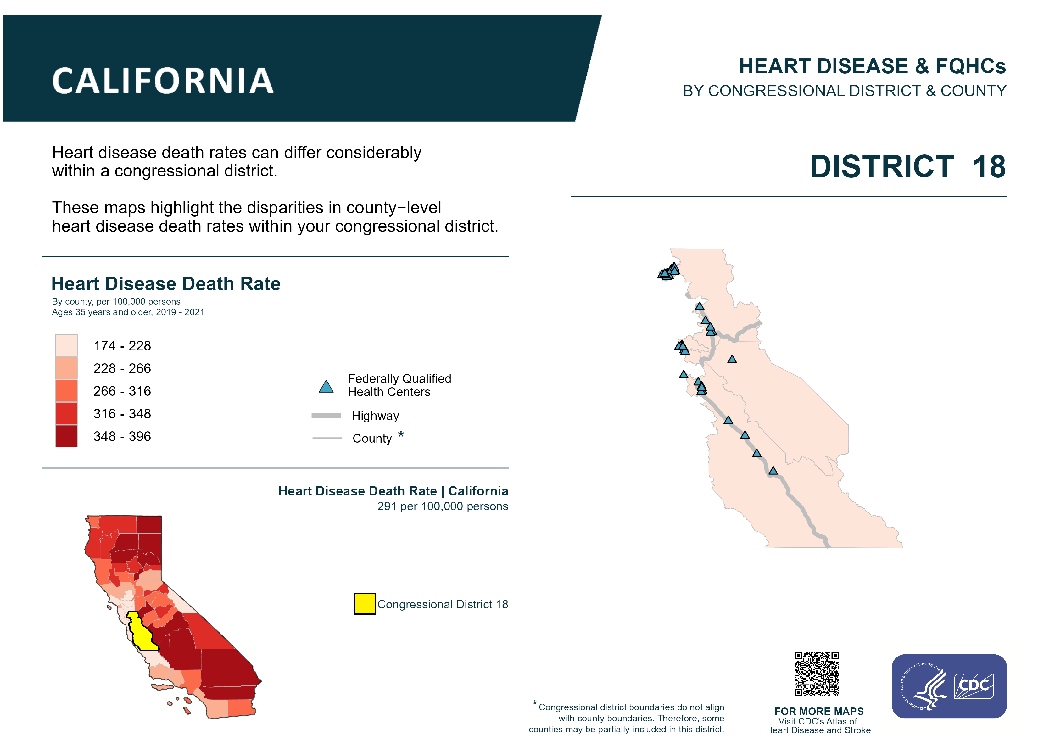 CA: Congressional District 18, Heart Disease and Federally Qualified Health Centers Map [118th Congress]