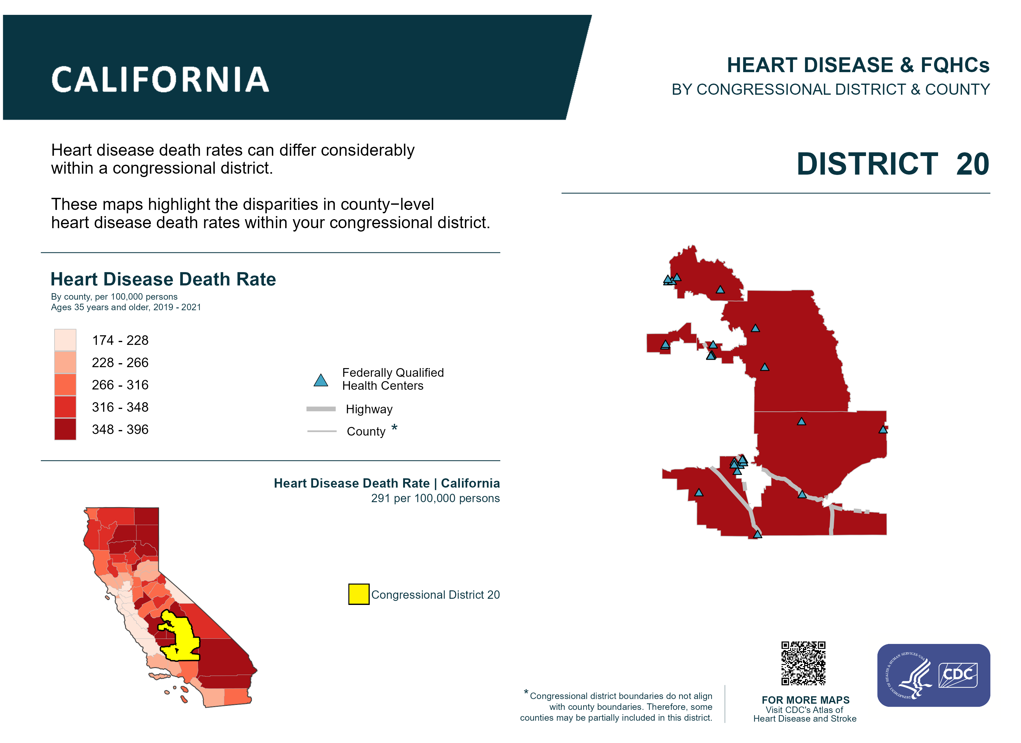 CA: Congressional District 20, Heart Disease and Federally Qualified Health Centers Map [118th Congress]