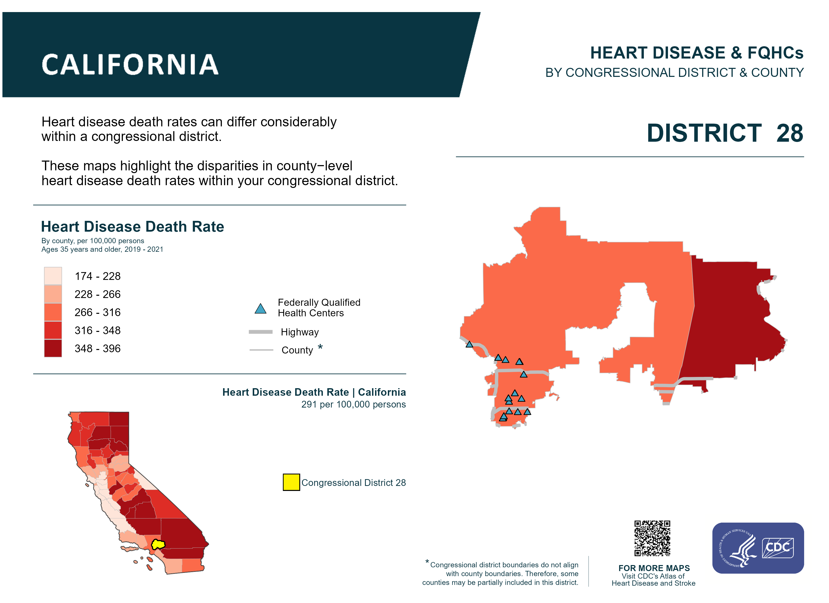CA: Congressional District 28, Heart Disease and Federally Qualified Health Centers Map [118th Congress]