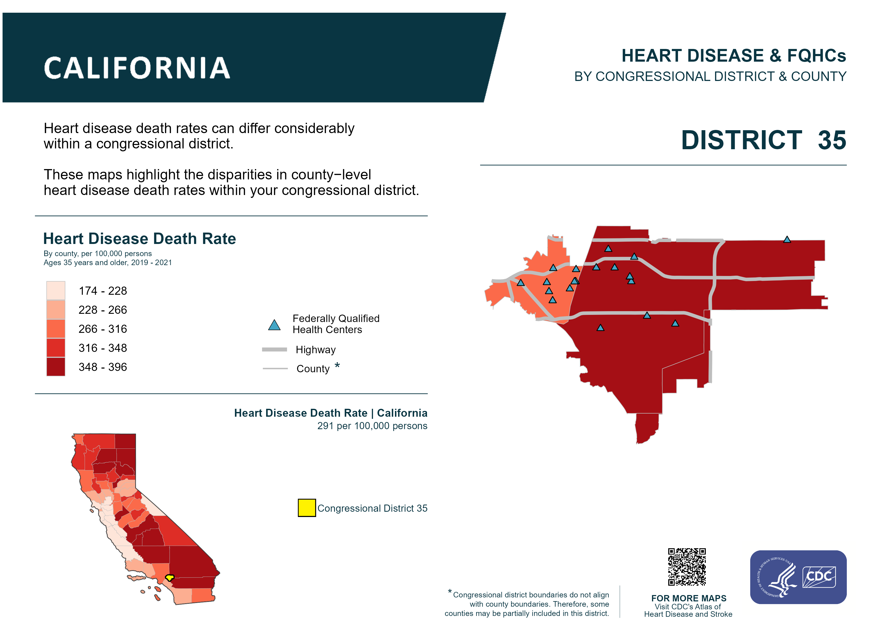 Description:Heart disease death rates can differ considerably within a congressional district. These maps highlight the disparities in county-level heart disease death rates within your congressional district. This map represents data for California Congressional District 35.