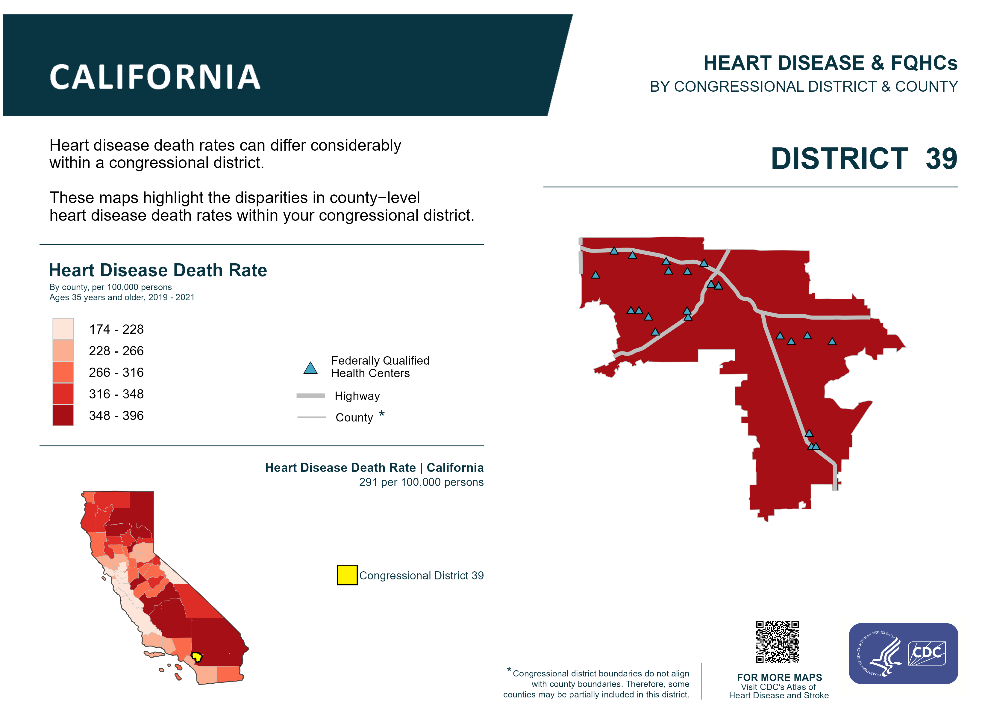 Description:Heart disease death rates can differ considerably within a congressional district. These maps highlight the disparities in county-level heart disease death rates within your congressional district. This map represents data for California Congressional District 39.