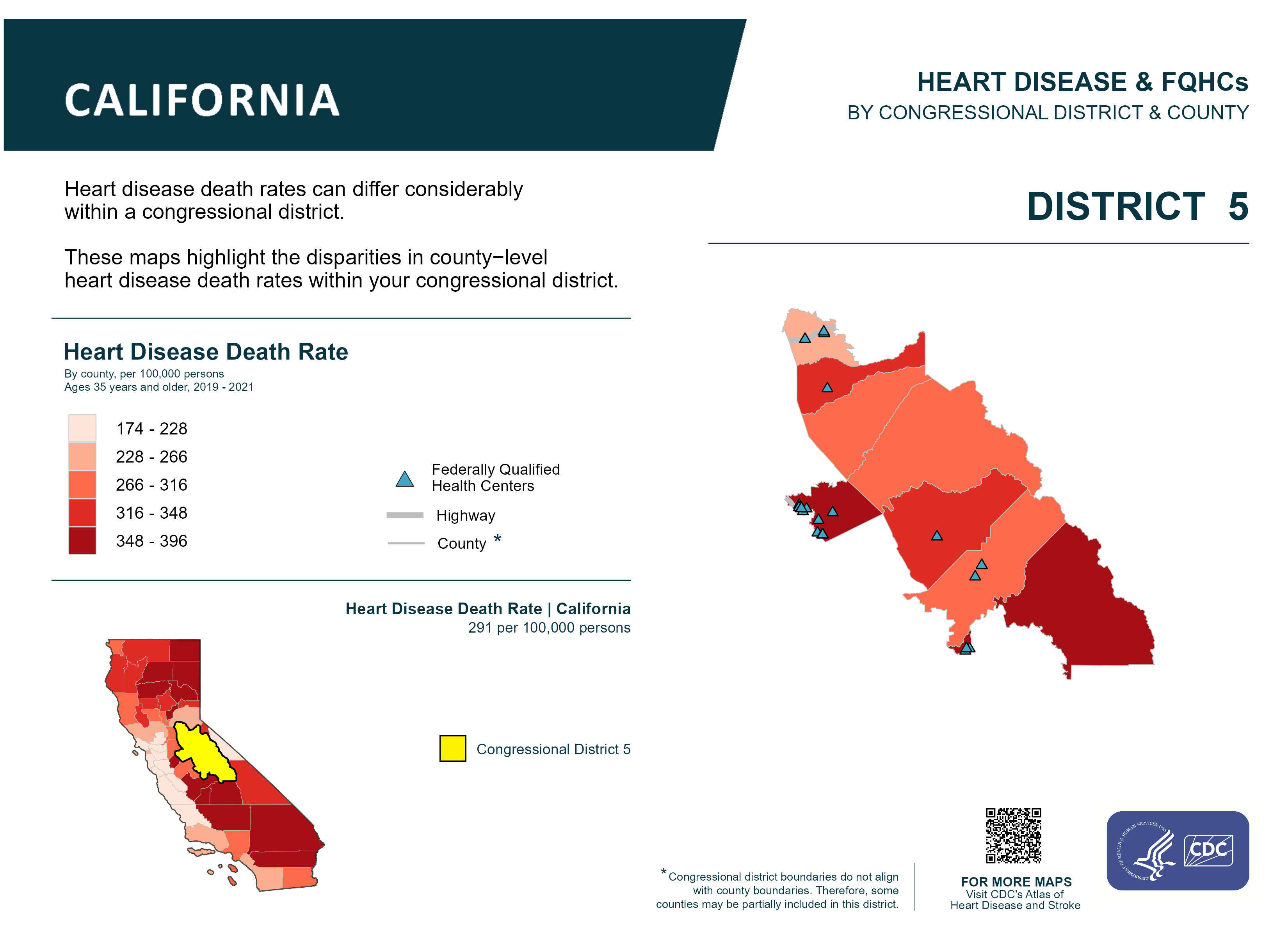 CA: Congressional District 05, Heart Disease and Federally Qualified Health Centers Map [118th Congress]