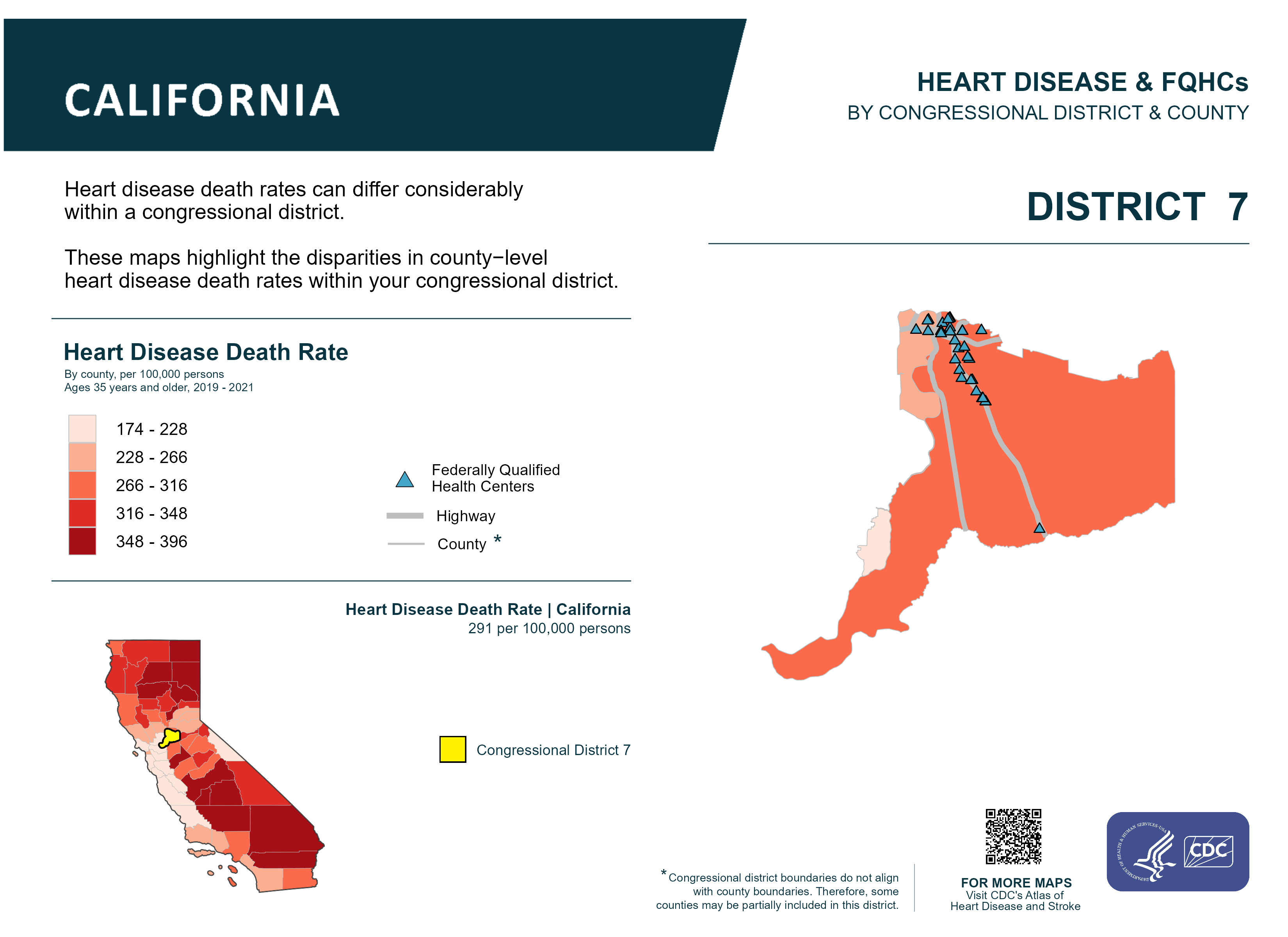 CA: Congressional District 07, Heart Disease and Federally Qualified Health Centers Map [118th Congress]