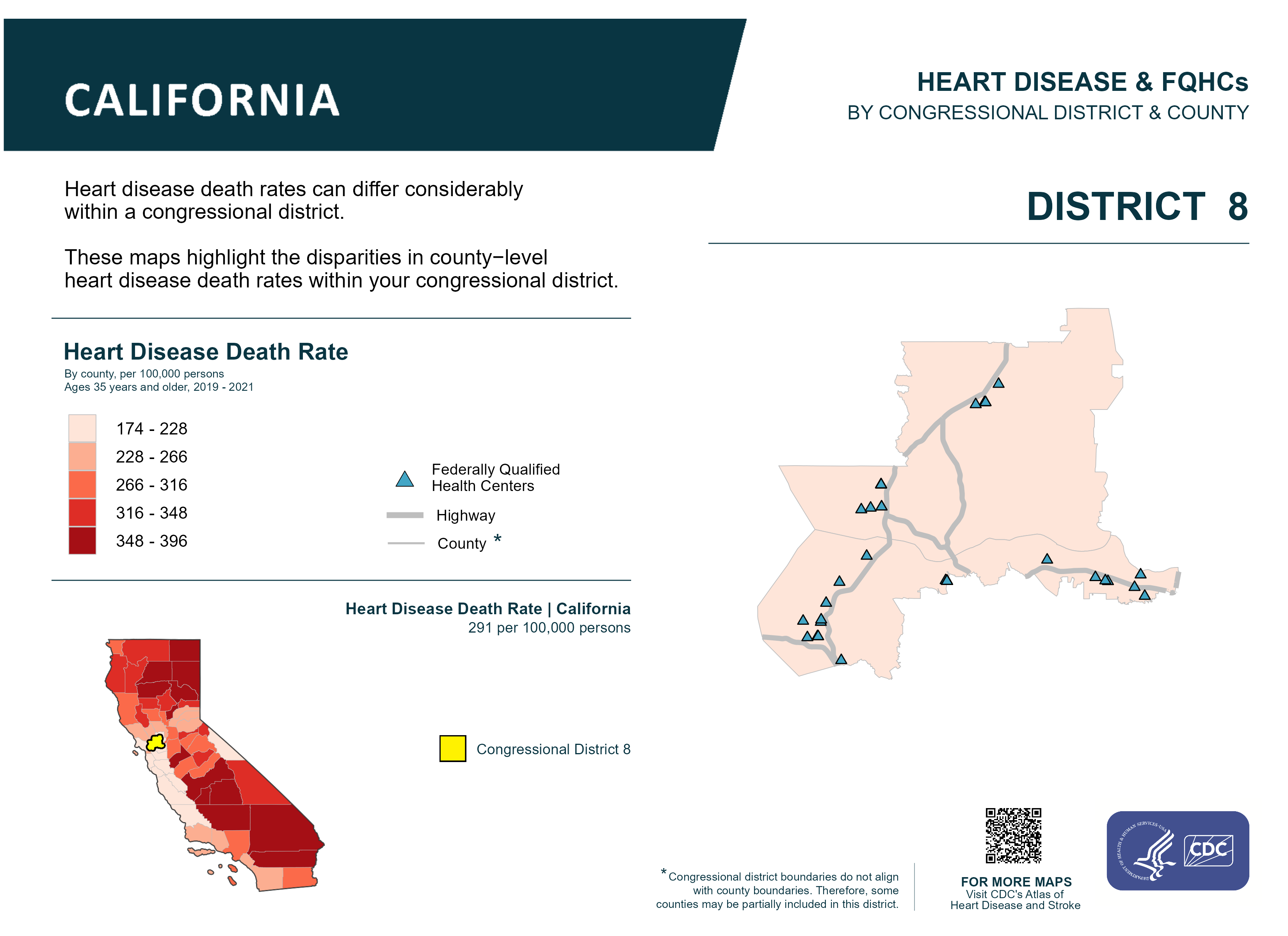 CA: Congressional District 08, Heart Disease and Federally Qualified Health Centers Map [118th Congress]