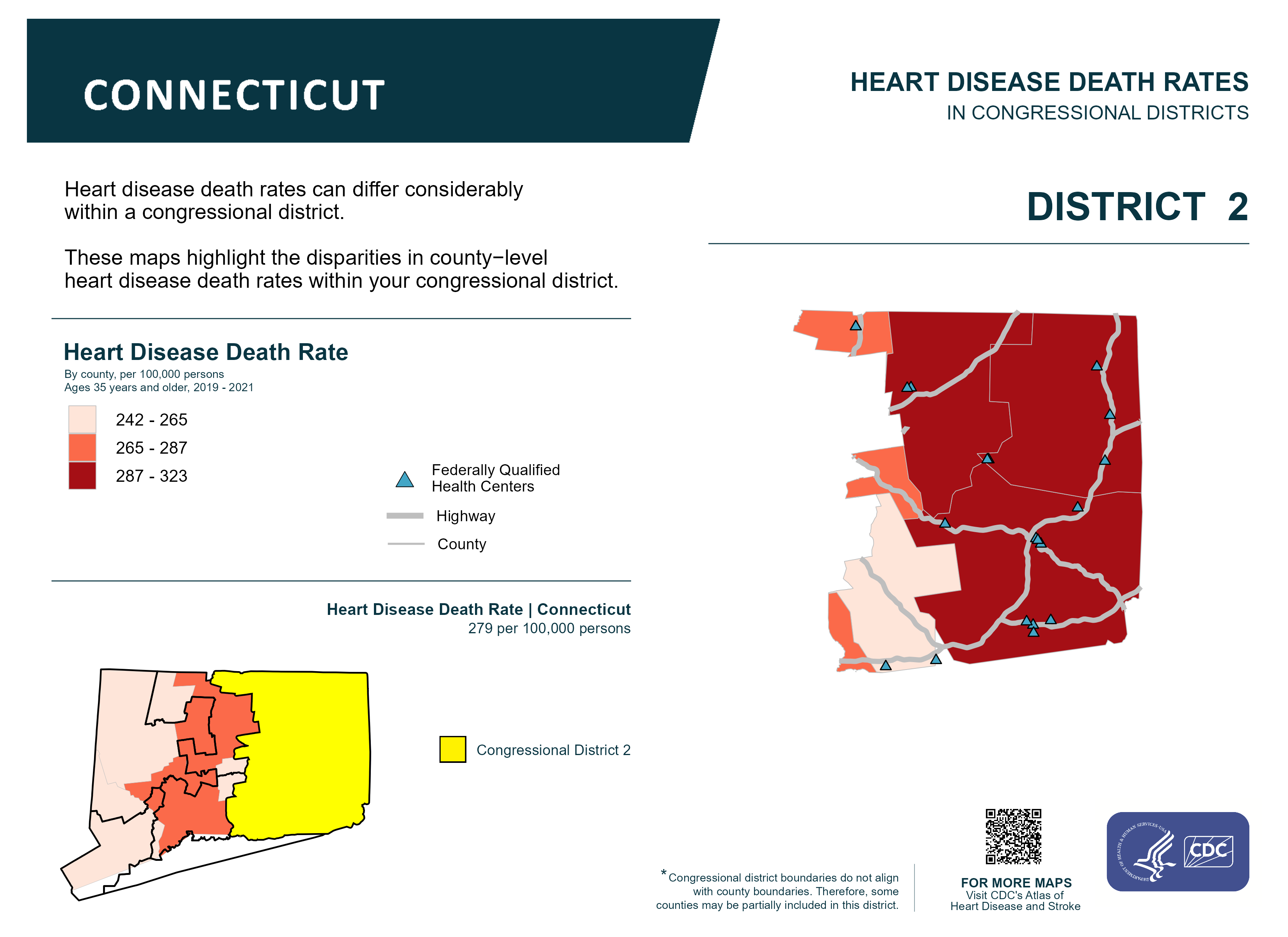 CT: Congressional District 02, Heart Disease and Federally Qualified Health Centers Map [118th Congress]