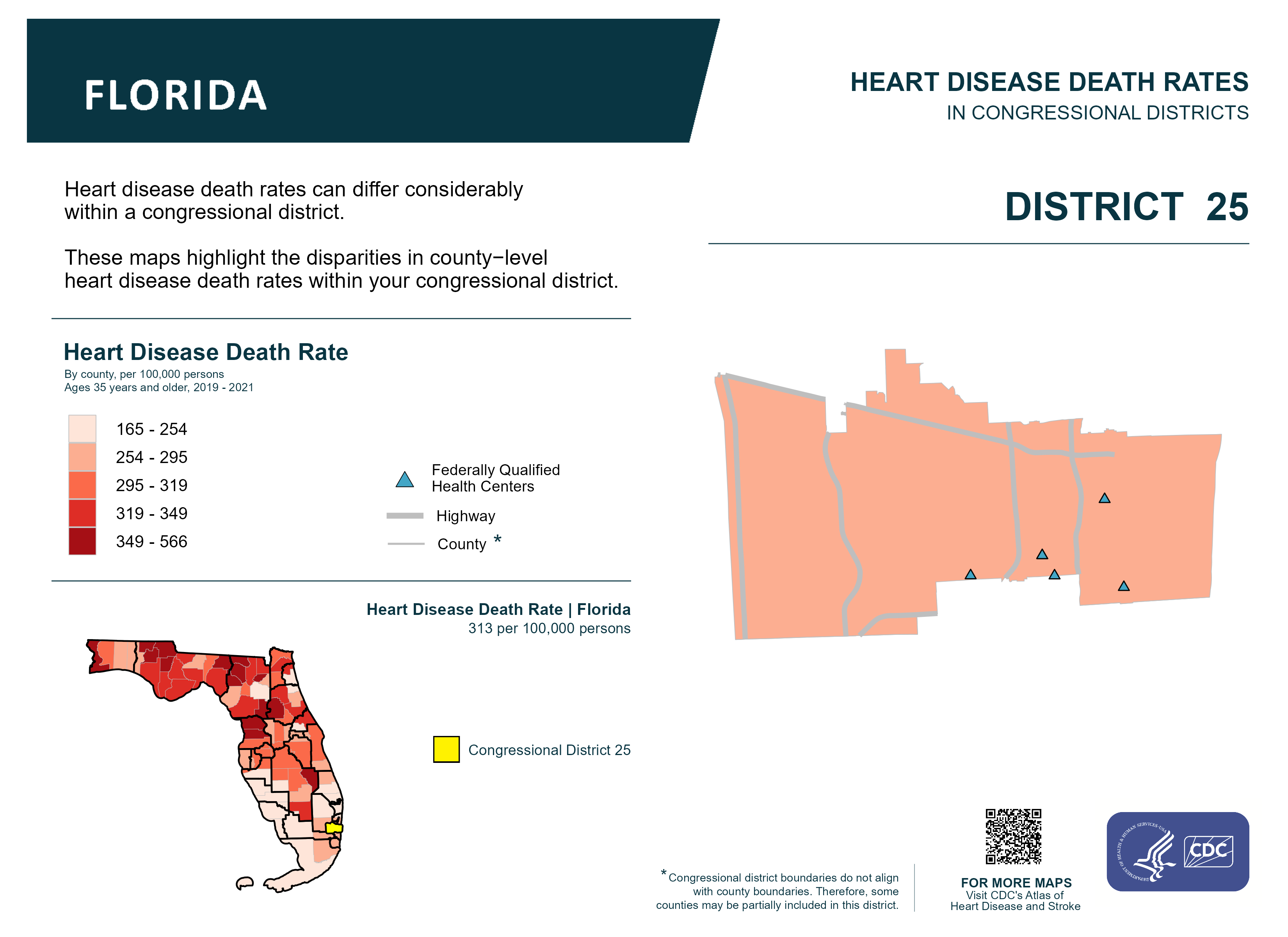 Description:Heart disease death rates can differ considerably within a congressional district. These maps highlight the disparities in county-level heart disease death rates within your congressional district. This map represents data for Florida Congressional District 25.