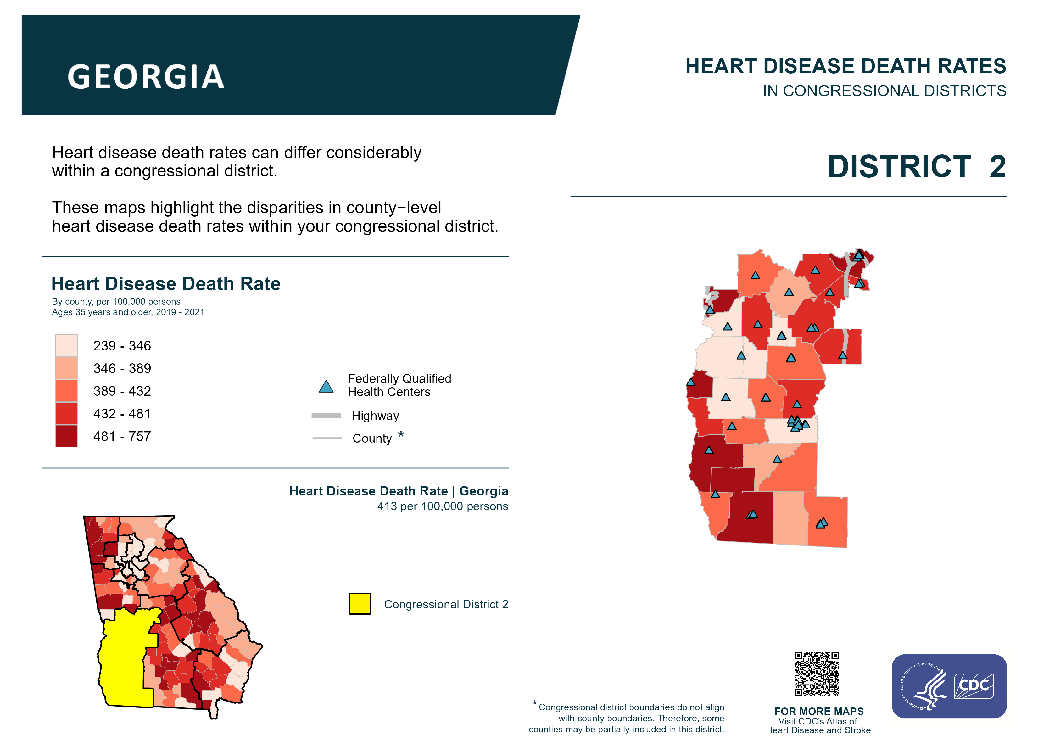 GA: Congressional District 02, Heart Disease and Federally Qualified Health Centers Map [118th Congress]