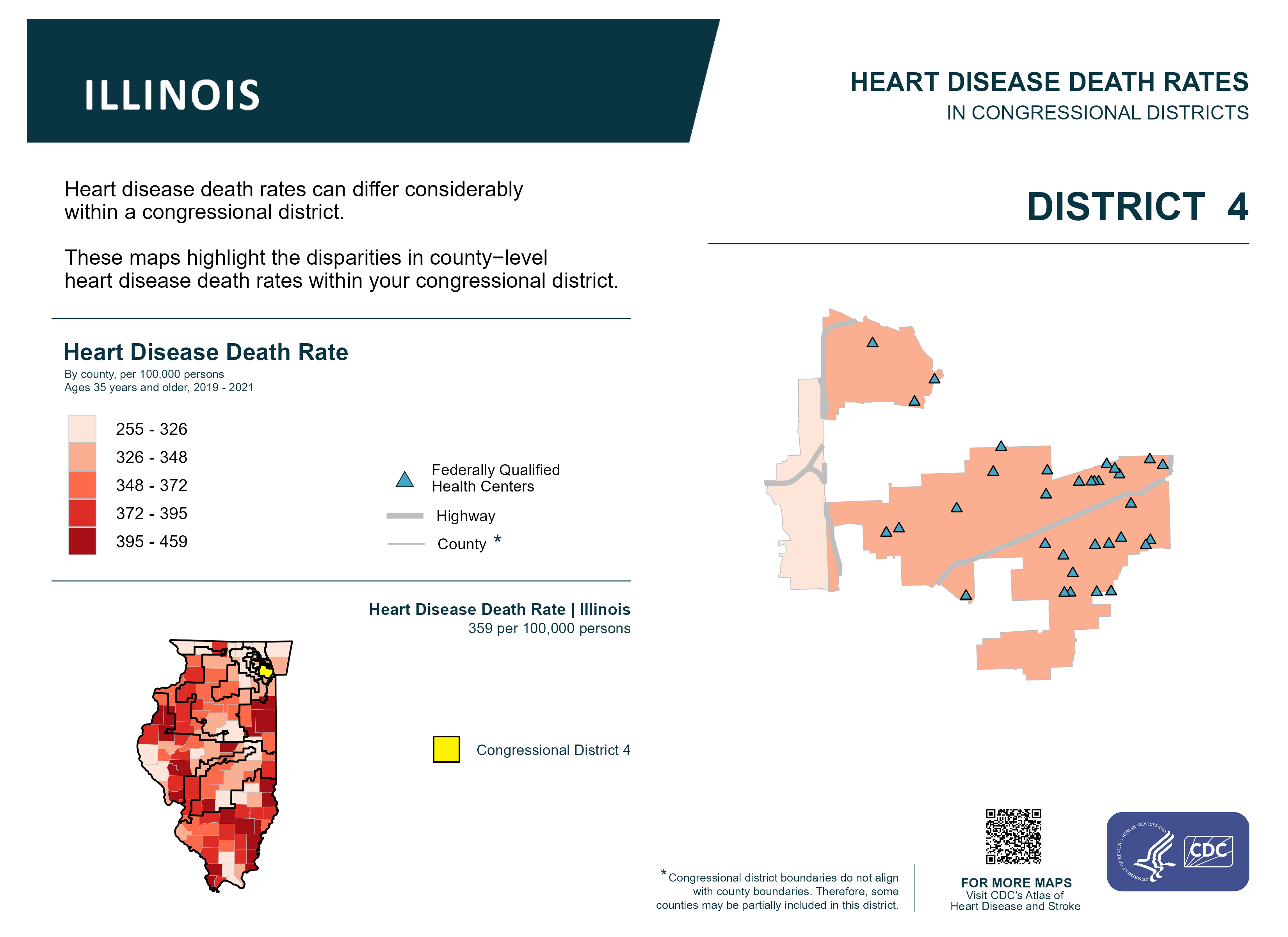 IL: Congressional District 04, Heart Disease and Federally Qualified Health Centers Map [118th Congress]
